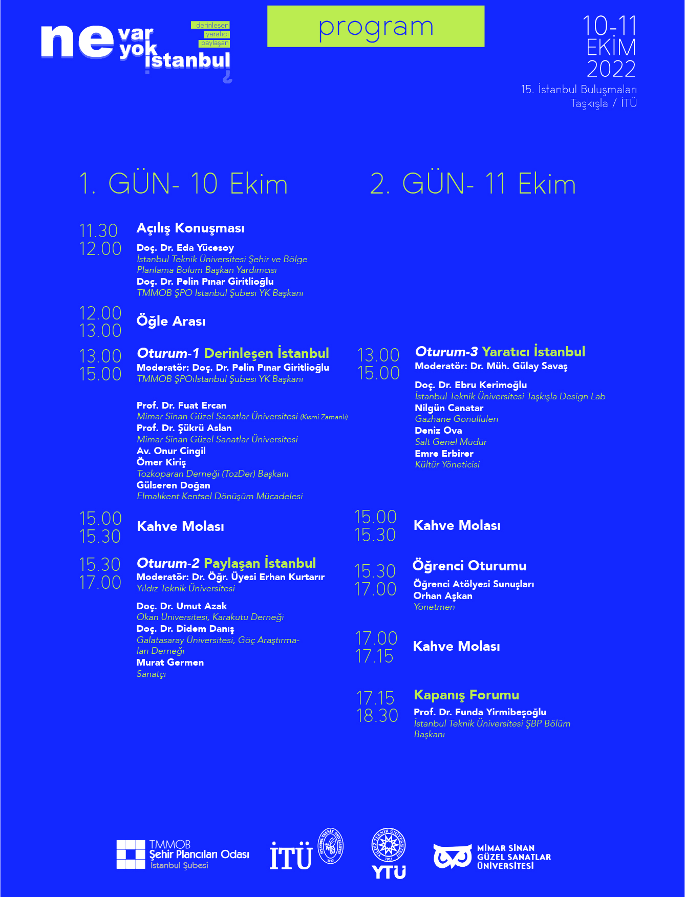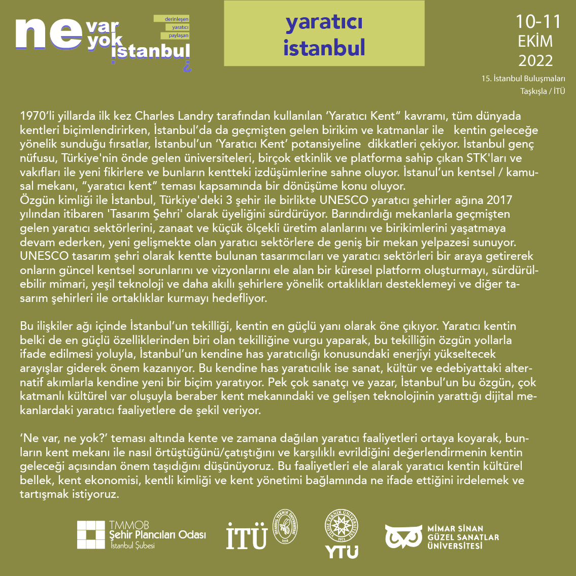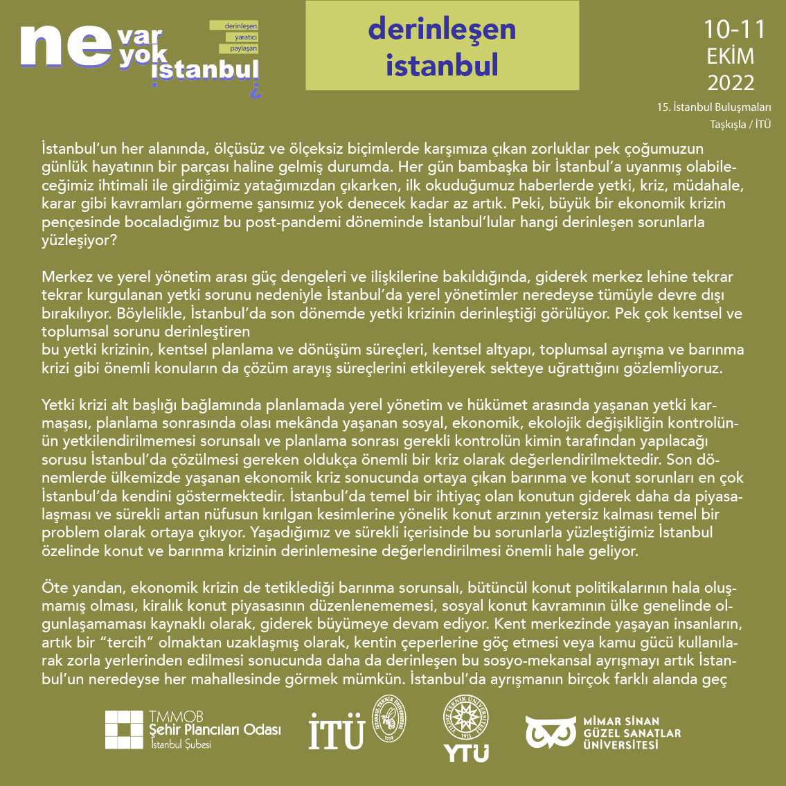 10-11 Ekim 2022 tarihlerinde İstanbul Teknik Üniversitesi Mimarlık Fakültesi Taşkışla Binası`nda 109 numaralı Prof. Nezih Eldem Salonu`nda gerçekleşecek olan 15. İstanbul Buluşmaları`na ilgili herkes davetlimizdir. Gelin İstanbul`un Ne Var, Ne Yok diyerek hem hatrını soralım, hem de varını ve yoğunu beraber irdeleyelim.