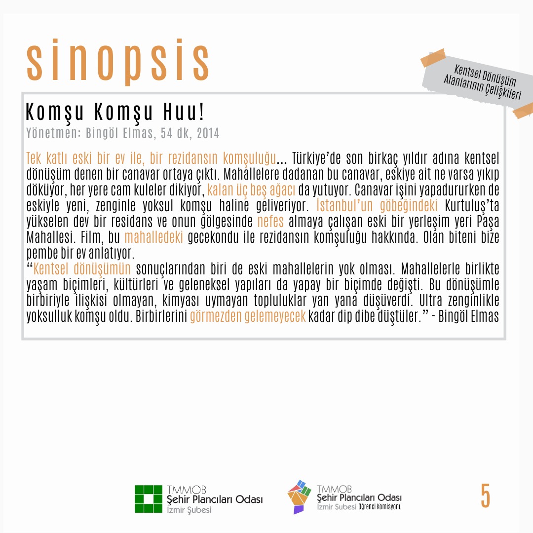 Filmimiz "Komşu Komşu Huuu!" ile bir gecekondu ve rezidansın arkadaşlığını ve kentsel dönüşümün mekânsal çelişkilerini tartışmayı hedefliyoruz.