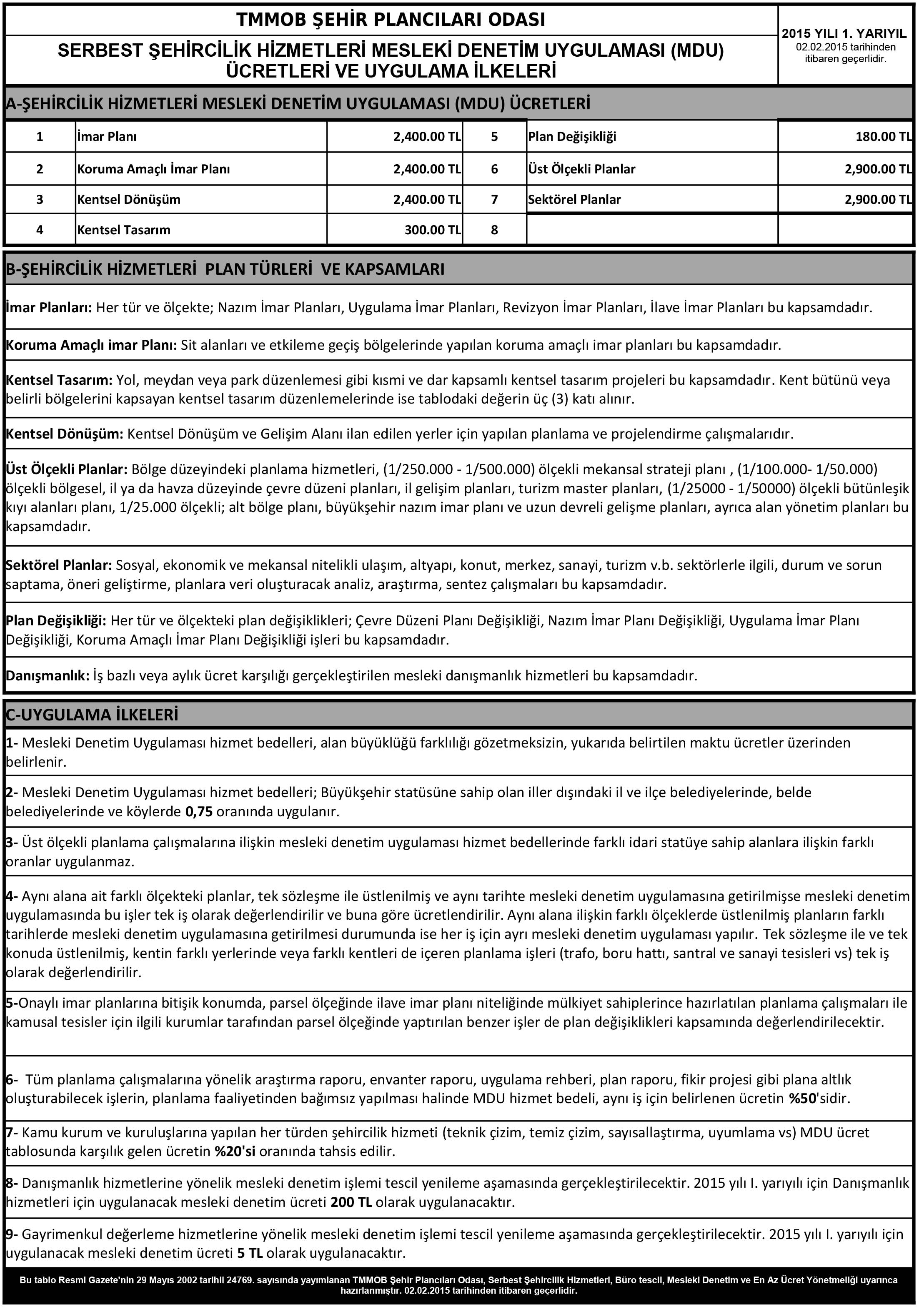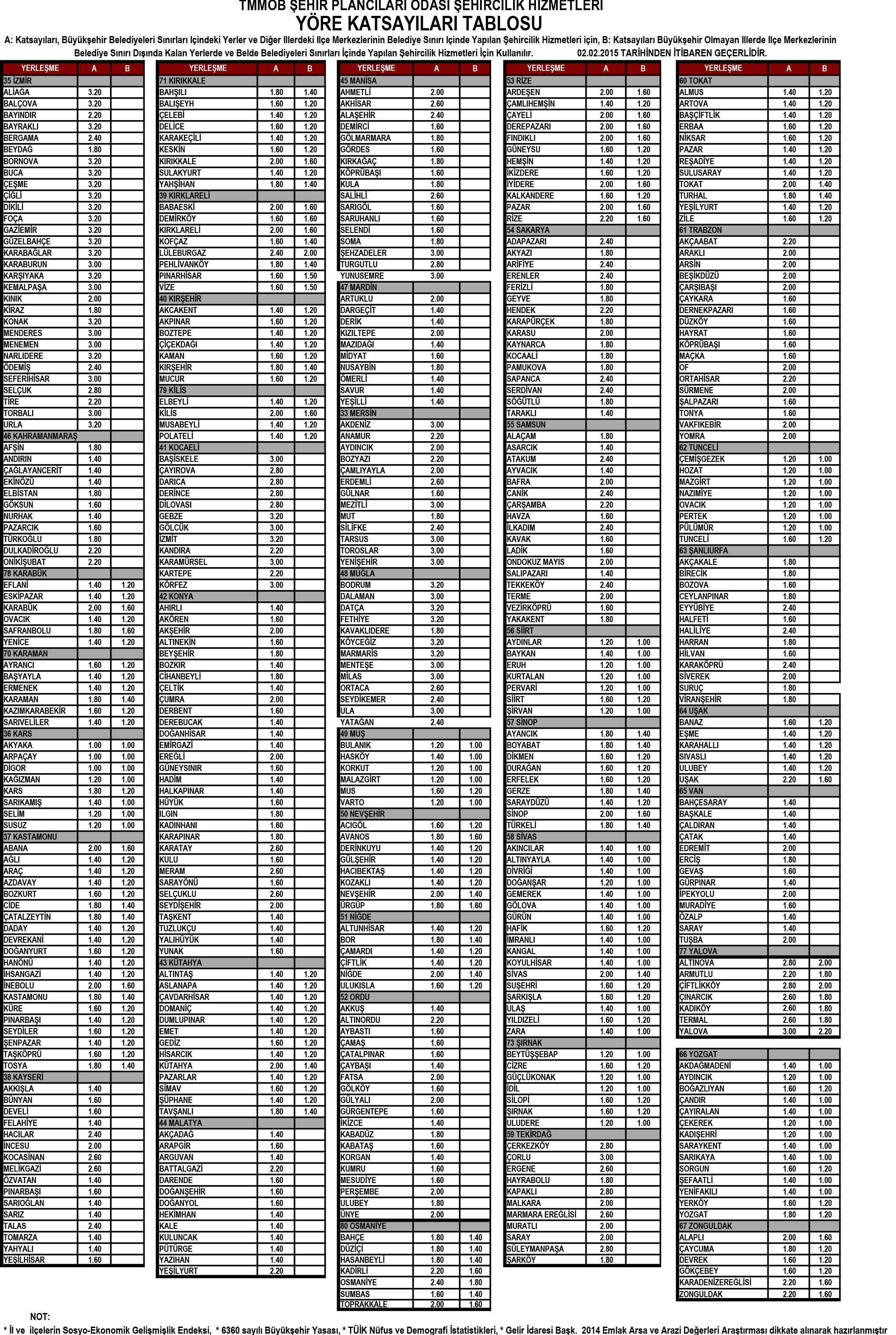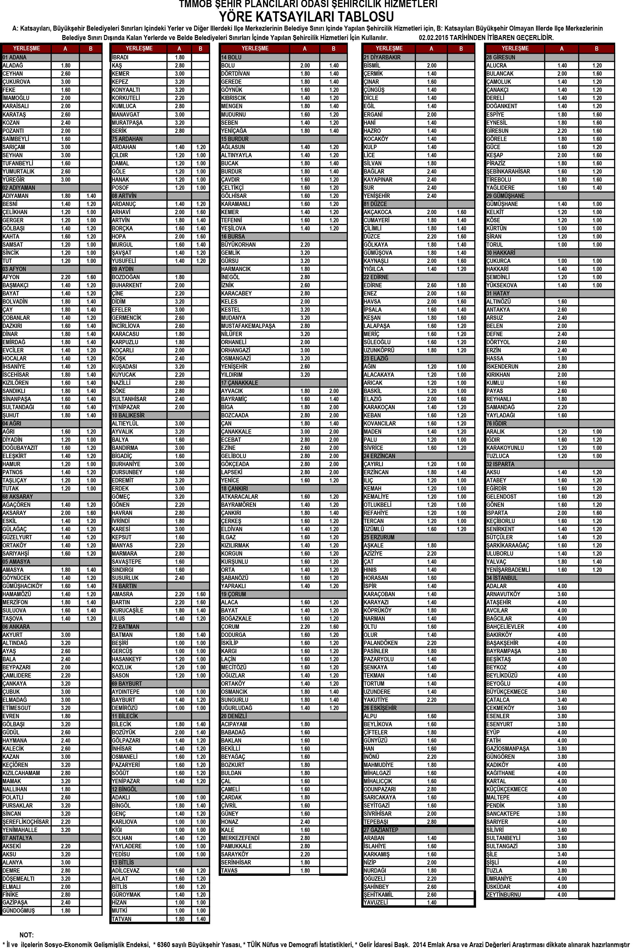 02.02.2015 İTİBARİYLE UYGULANACAK OLAN MDU ÜCRETLERİ VE YÖRE KATSAYILARI TABLOSU GÜNCELLENMİŞTİR!