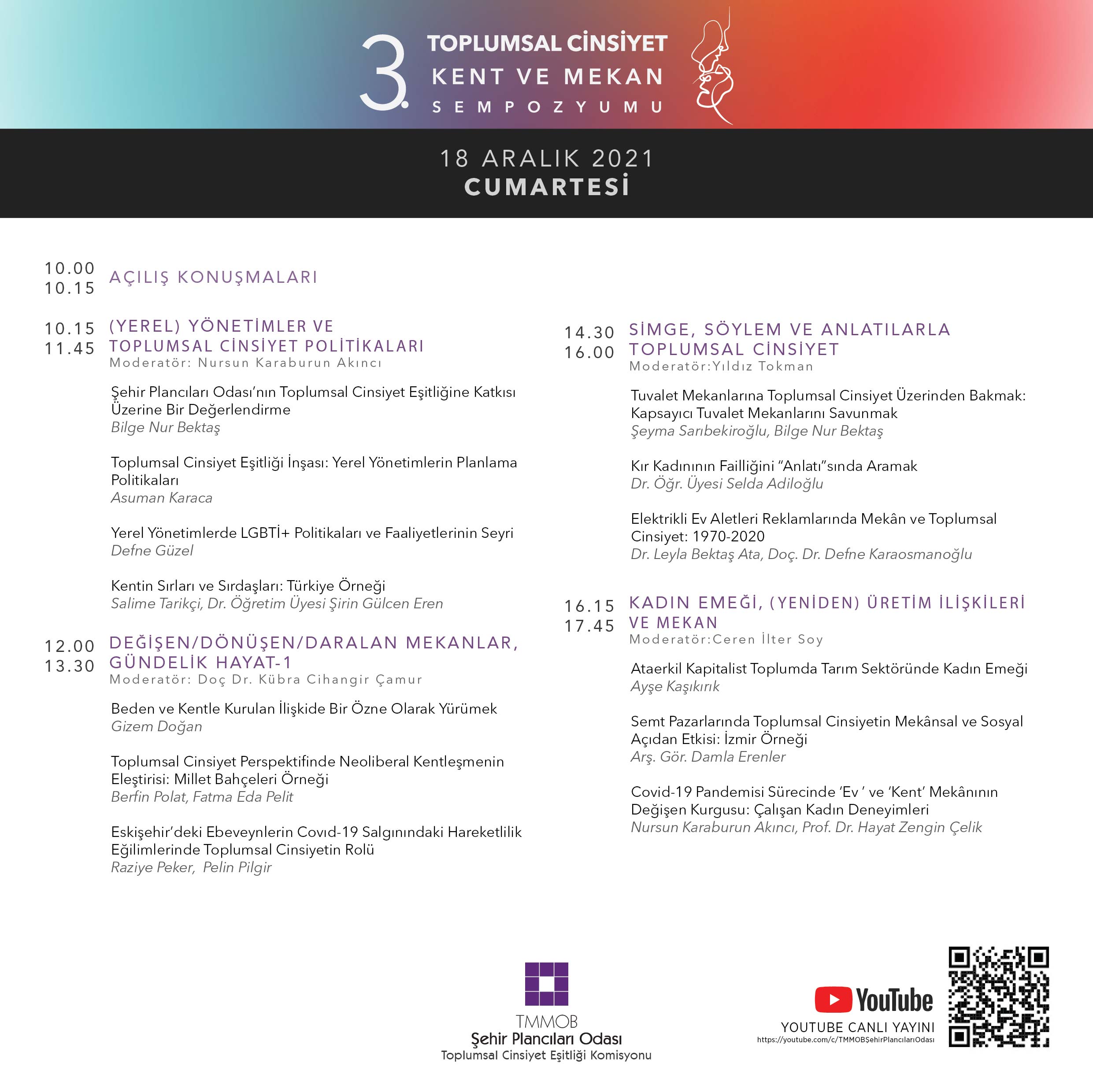 18-19 Aralık 2021 tarihlerinde gerçekleşecek olan 3. Toplumsal Cinsiyet Eşitliği Sempozyumu programı belirlendi. Sempozyumu TMMOB Şehir Plancıları Odası YouTube hesabı üstünden canlı takip edebilirsiniz.