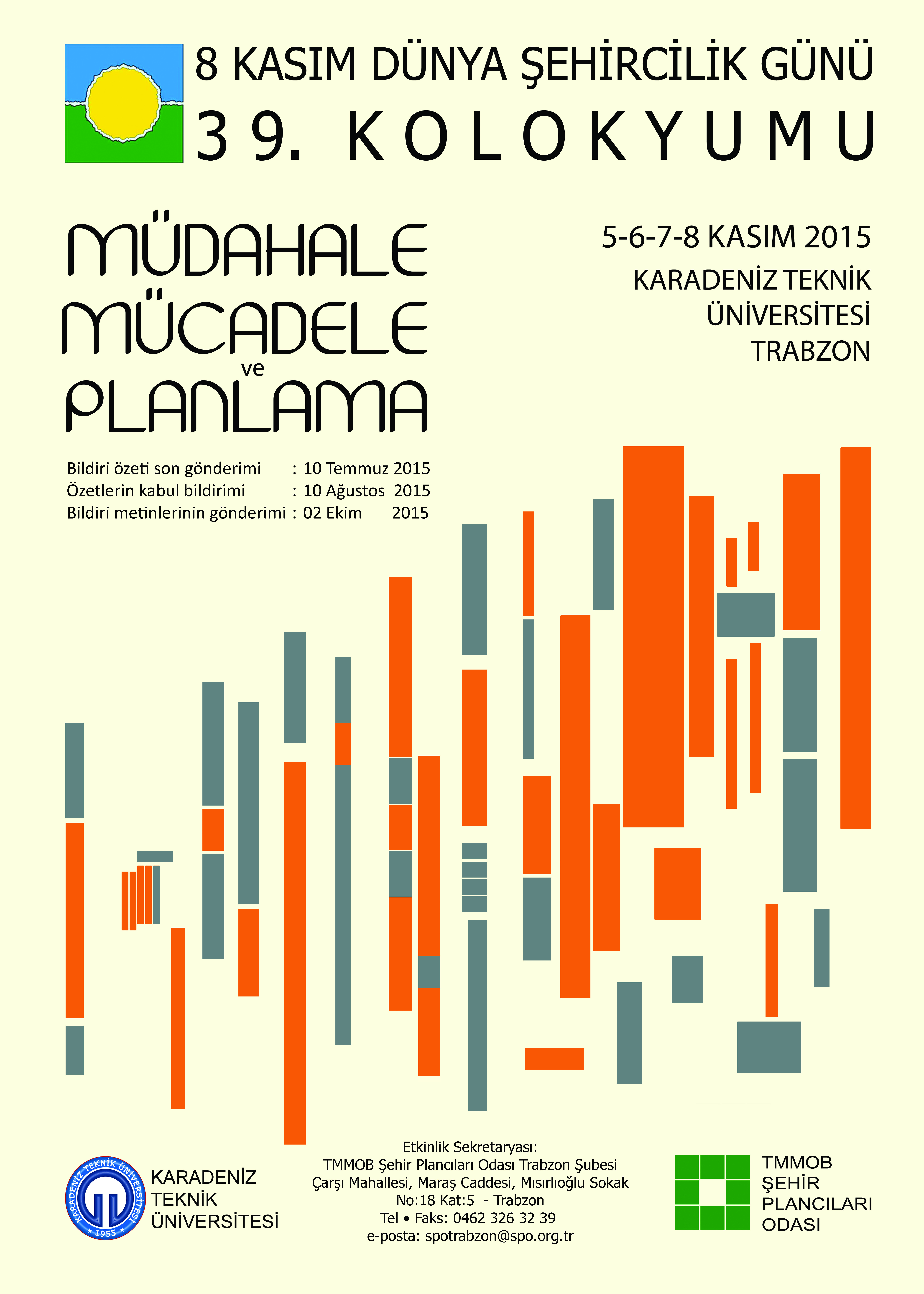 Bu çerçevede; her yıl 8 Kasım Dünya Şehircilik Günü etkinlikleri kapsamında, bu yıl 39.su düzenlenecek olan Dünya Şehircilik Günü Kolokyumu`nun ana teması; "Müdahale, Mücadele ve Planlama" olarak belirlenmiştir. 5-8 Kasım 2015 tarihlerinde, Trabzonda; TMMOB Şehir Plancıları Odası Trabzon Şubesi sekretaryasında ve Karadeniz Teknik Üniversitesi ev sahipliğinde gerçekleştirilecek olan, 39. Dünya Şehircilik Günü Kolokyumu`nda belirlenen ana tema çerçevesinde;