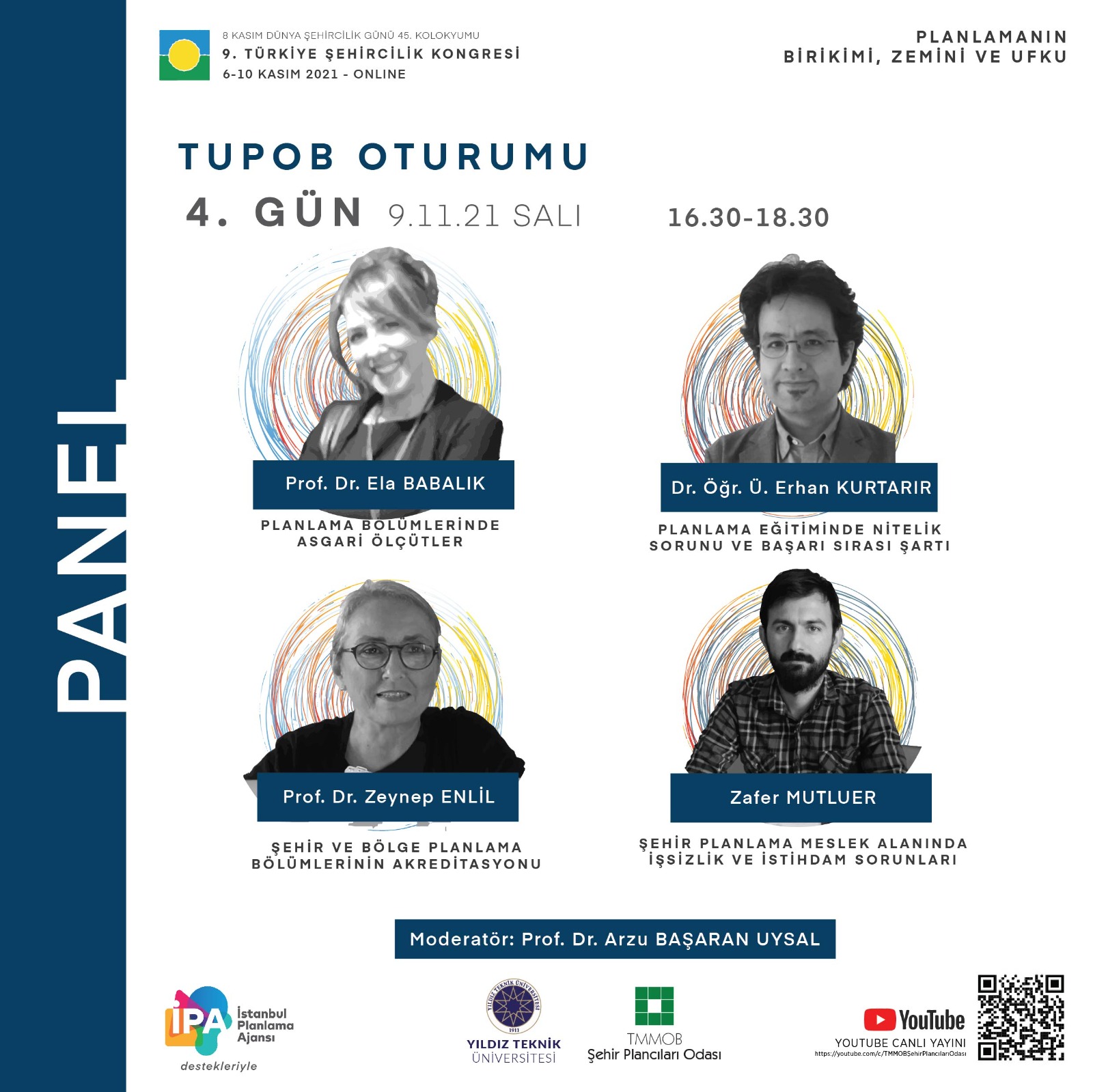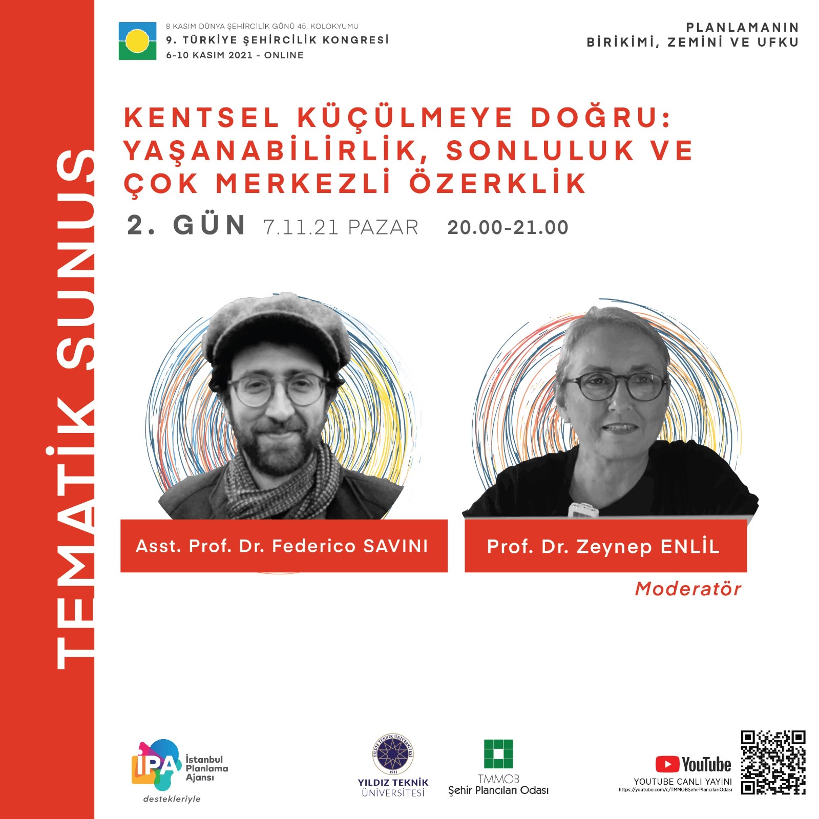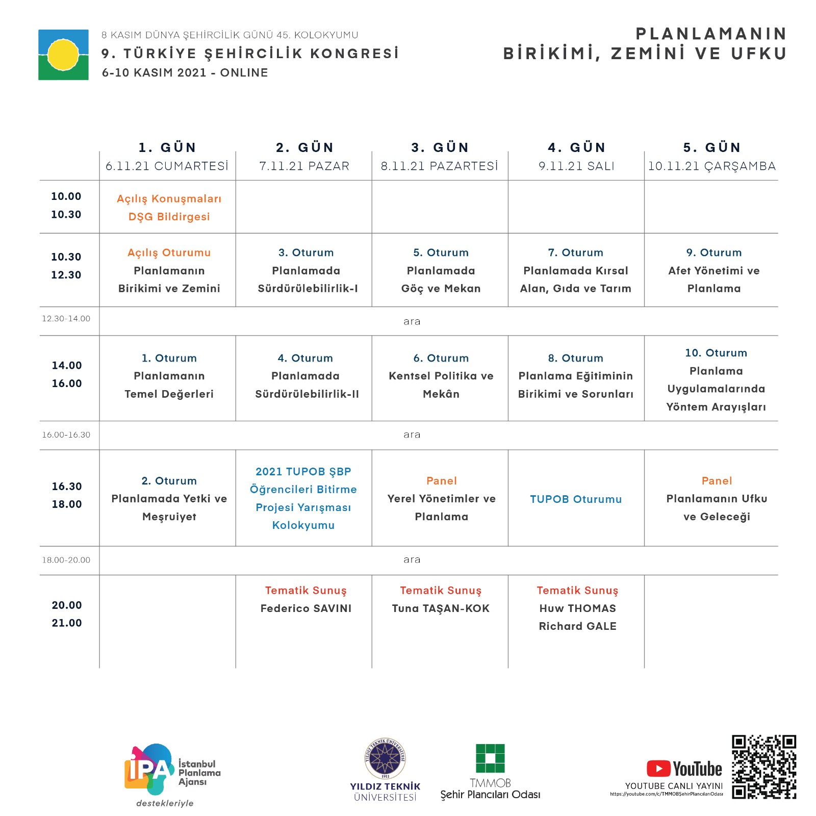 8 Kasım Dünya Şehircilik Günü 45. Kolokyumu 9. Türkiye Şehircilik Kongresi 6-10 Kasım 2021 tarihlerinde "Planlamanın Birikimi, Zemini ve Ufku" temasıyla TMMOB Şehir Plancıları Odası YouTube hesabından canlı olarak gerçekleştirilecektir. Kongre programına ve görsellere ekten ulaşabilirsiniz.