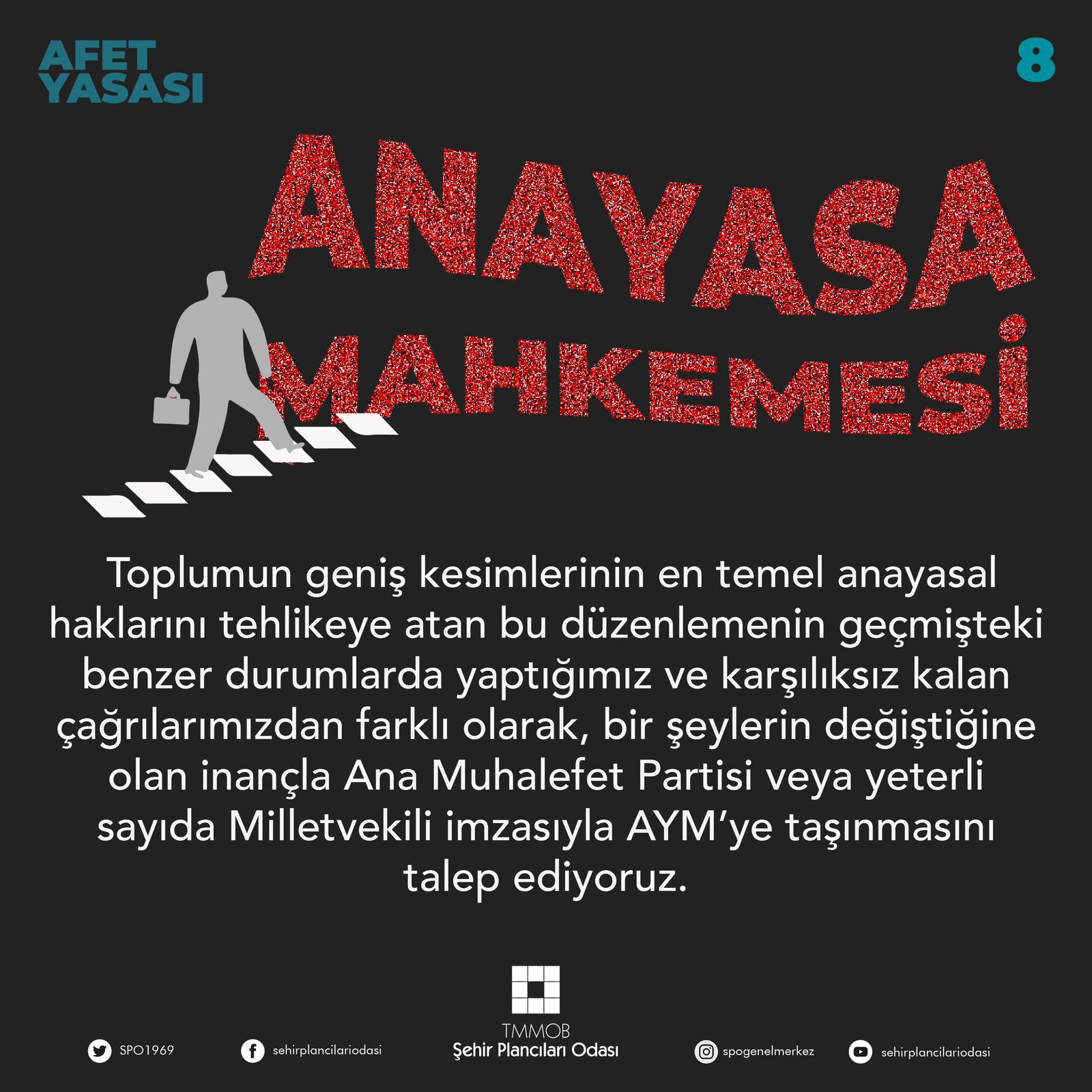 8- Toplumun geniş kesimlerinin en temel anayasal haklarını tehlikeye atan bu düzenlemenin geçmişteki benzer durumlarda yaptığımız ve karşılıksız kalan çağrılarımızdan farklı olarak, birşeylerin değiştiğine olan inançla Ana Muhalefet Partisi veya yeterli sayıda Milletvekili imzasıyla AYM`ye taşınmasını talep ediyoruz.