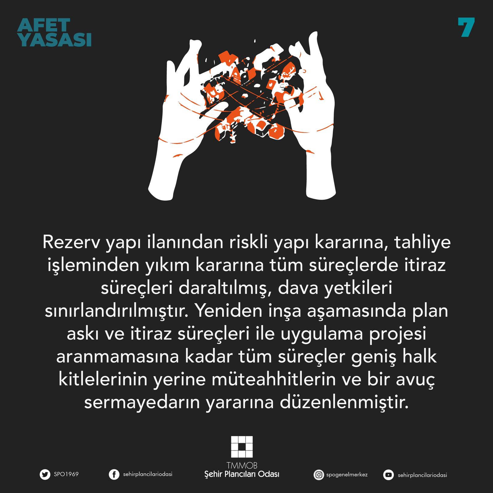 7- Rezerv yapı ilanından riskli yapı kararına, tahliye işleminden yıkım kararına tüm süreçlerde itiraz süreçleri daraltılmış, dava yetkileri sınırlandırılmıştır. Yeniden inşa aşamasında plan askı ve itiraz süreçleri ile uygulama projesi aranmamasına kadar tüm süreçler geniş halk kitlelerinin yerine müteahhitlerin ve bir avuç sermayedarın yararına düzenlenmiştir.