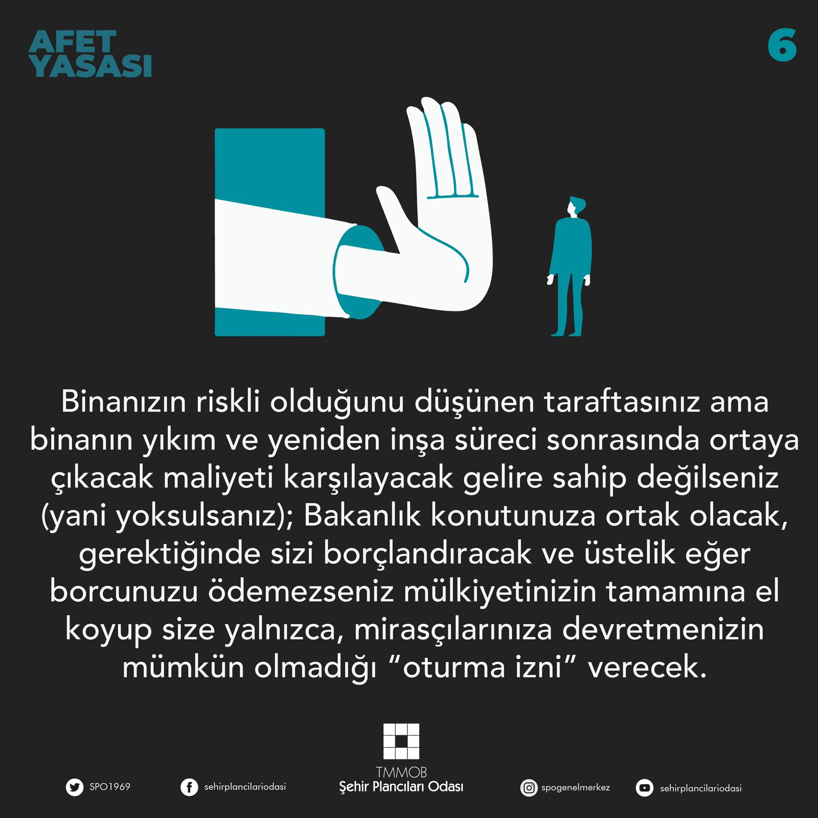 6- Binanızın riskli olduğunu düşünen taraftasınız ama binanın yıkım ve yeniden inşa süreci sonrasında ortaya çıkacak maliyeti karşılayacak gelire sahip değilseniz (yani yoksulsanız); Bakanlık konutunuza ortak olacak, gerektiğinde sizi borçlandıracak ve üstelik eğer borcunuzu ödemezseniz mülkiyetinizin tamamına el koyup size yalnızca, mirasçılarınıza devretmenizin mümkün olmadığı "oturma izni" verecek.