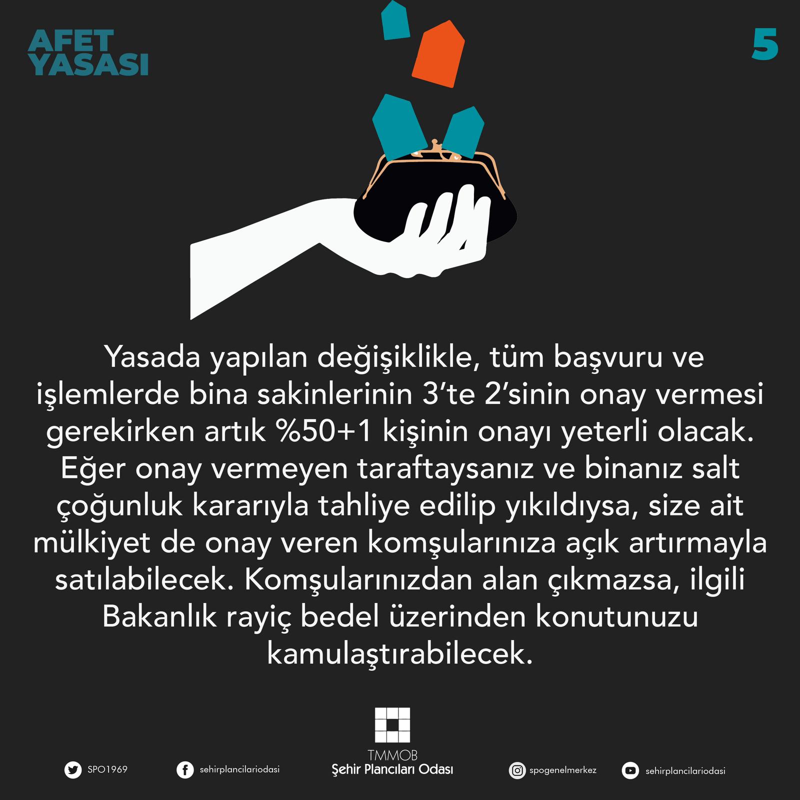 5- Yasada yapılan değişiklikle, tüm başvuru ve işlemlerde bina sakinlerinin 3`te 2`sinin onay vermesi gerekirken artık %50+1 kişinin onayı yeterli olacak. Eğer onay vermeyen taraftaysanız ve binanız salt çoğunluk kararıyla tahliye edilip yıkıldıysa, size ait mülkiyet de onay veren komşularınıza açık artırmayla satılabilecek. Komşularınızdan alan çıkmazsa, ilgili Bakanlık rayiç bedel üzerinden konutunuzu kamulaştırabilecek.
