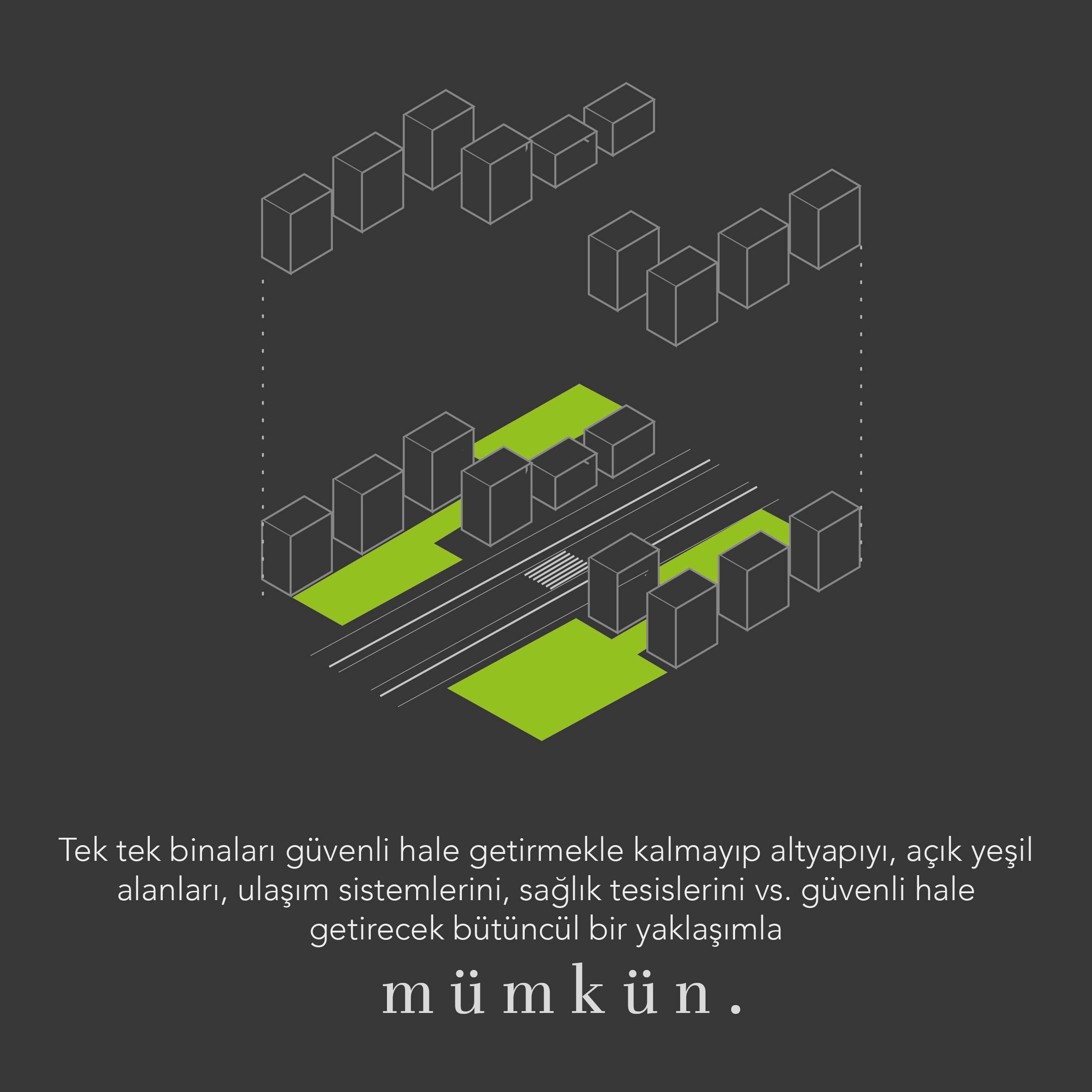 - Tek tek binaları güvenli hale getirmekle kalmayıp altyapıyı, açık yeşil alanları, ulaşım sistemlerini, sağlık tesislerini vs. güvenli hale getirecek bütüncül bir yaklaşımla mümkün.