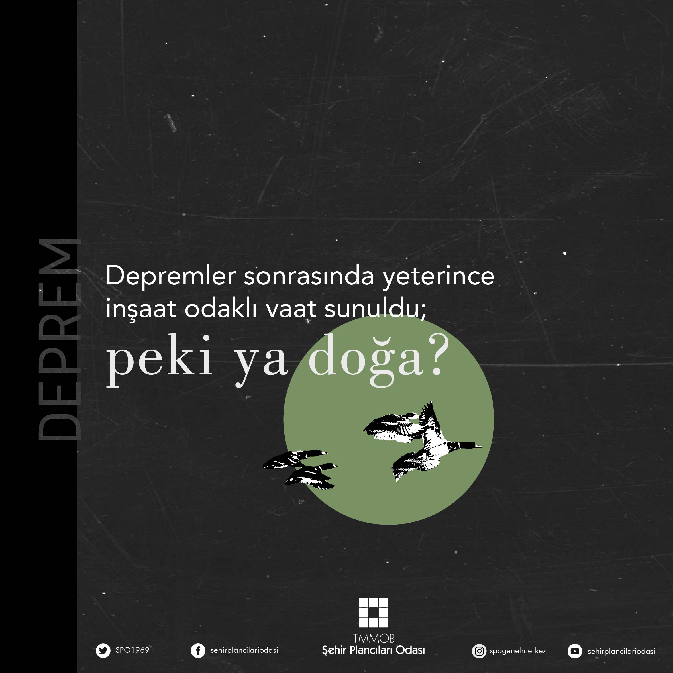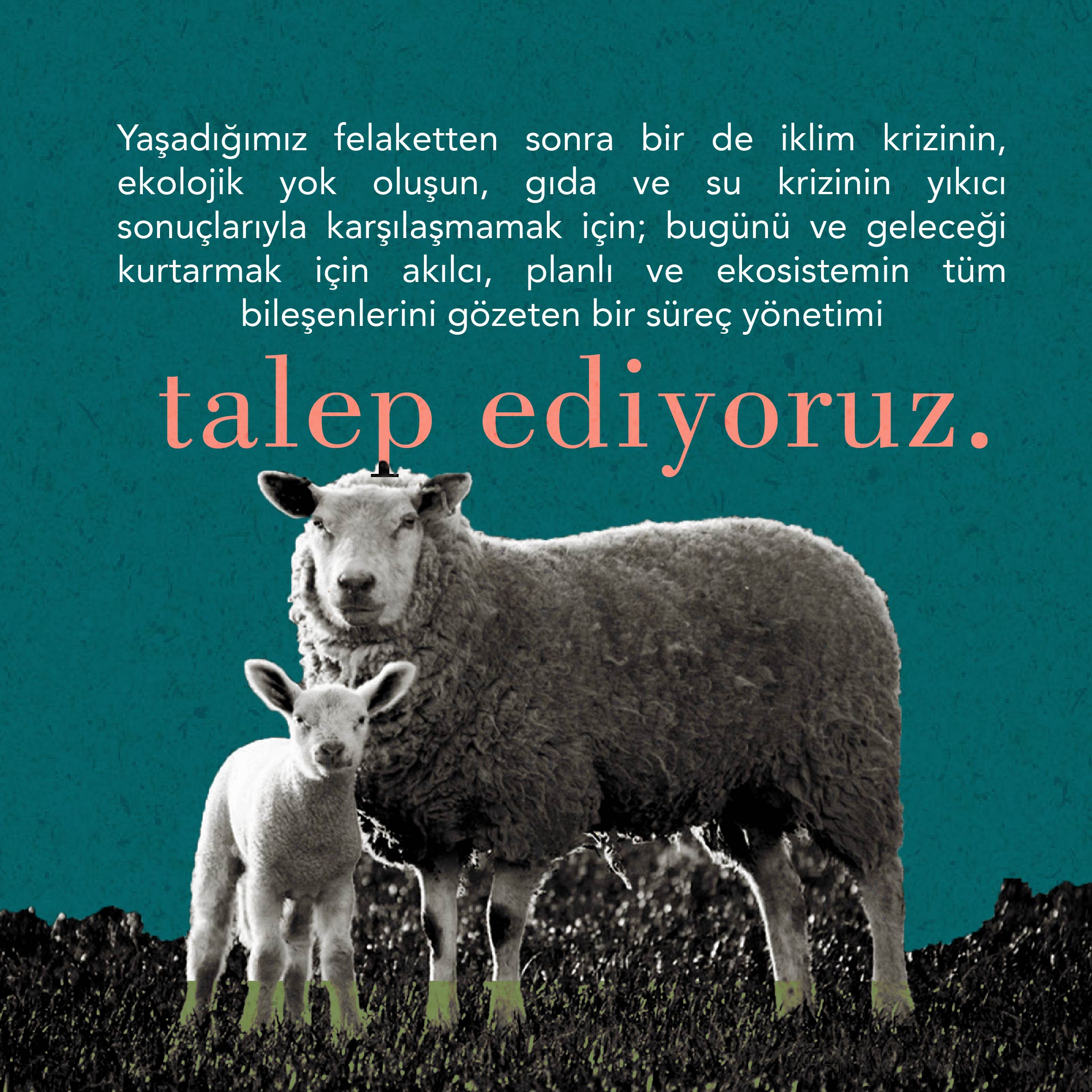 Yaşadığımız felaketten sonra bir de iklim krizinin, ekolojik yok oluşun, gıda ve su krizinin yıkıcı sonuçlarıyla karşılaşmamak için; bugünü ve geleceği kurtarmak için akılcı, planlı ve ekosistemin tüm bileşenlerini gözeten bir süreç yönetimi talep ediyoruz.