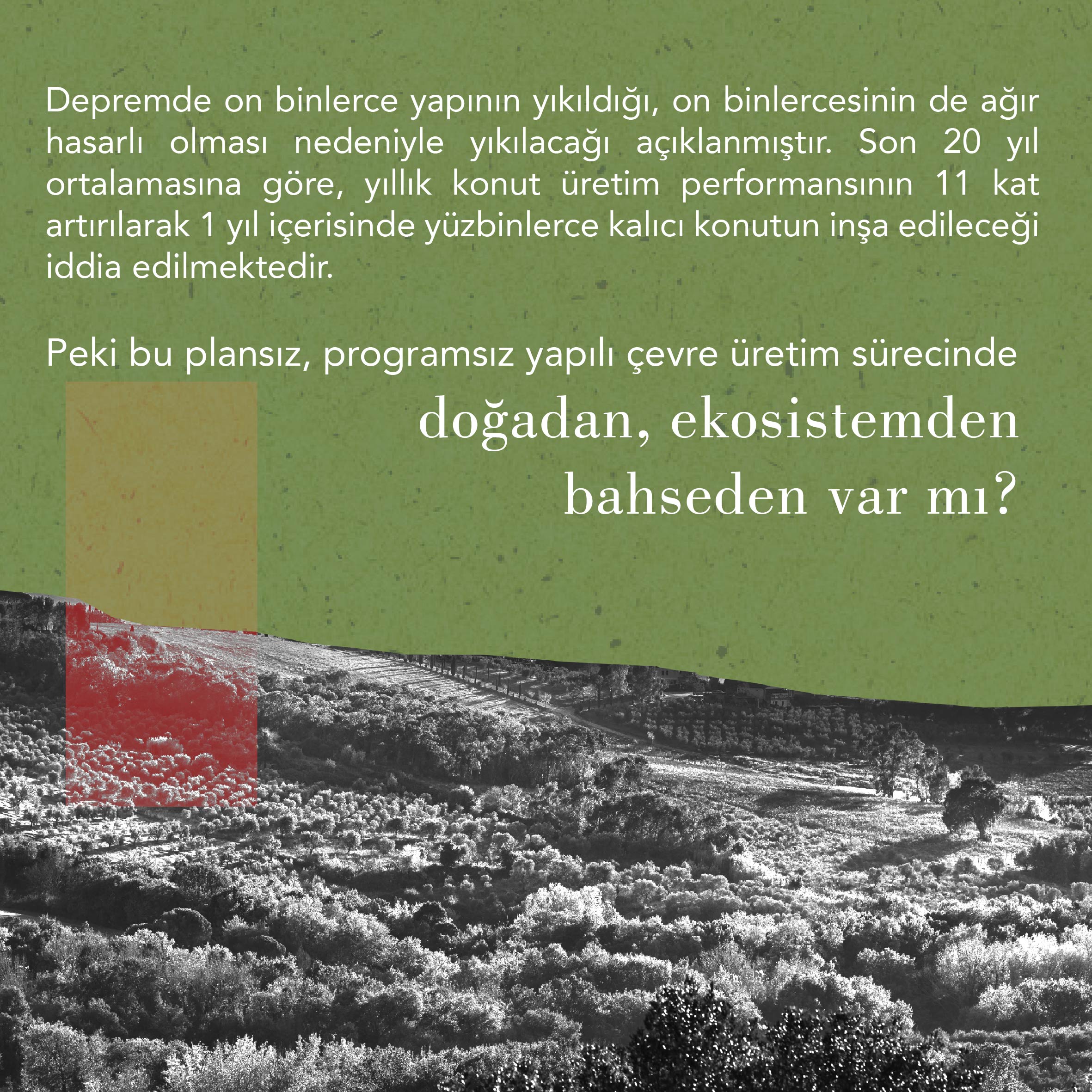 Depremde on binlerce yapının yıkıldığı, on binlercesinin de ağır hasarlı olması nedeniyle yıkılacağı açıklanmıştır. Son 20 yıl ortalamasına göre, yıllık konut üretim performansının 11 kat artırılarak 1 yıl içerisinde yüzbinlerce kalıcı konutun inşa edileceği iddia edilmektedir. Peki bu plansız, programsız, olağanüstü yapılı çevre üretim sürecinde doğadan, ekosistemden bahseden var mı?