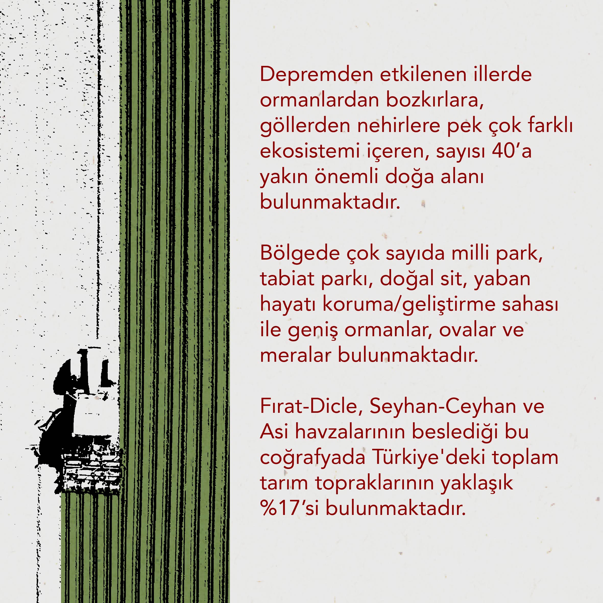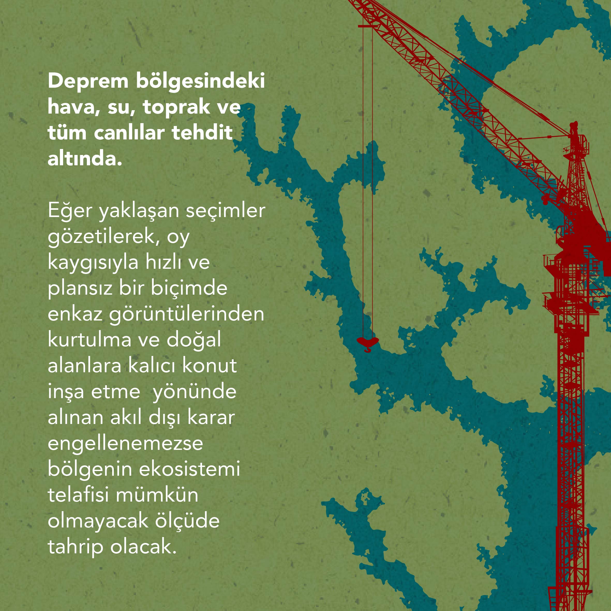 Deprem bölgesindeki hava, su, toprak ve tüm canlılar tehdit altında. Eğer yaklaşan seçimler gözetilerek, oy kaygısıyla hızlı ve plansız bir biçimde enkaz görüntülerinden kurtulma ve doğal alanlara kalıcı konut inşa etme yönünde alınan akıl dışı karar engellenemezse bölgenin ekosistemi telafisi mümkün olmayacak ölçüde tahrip olacak.