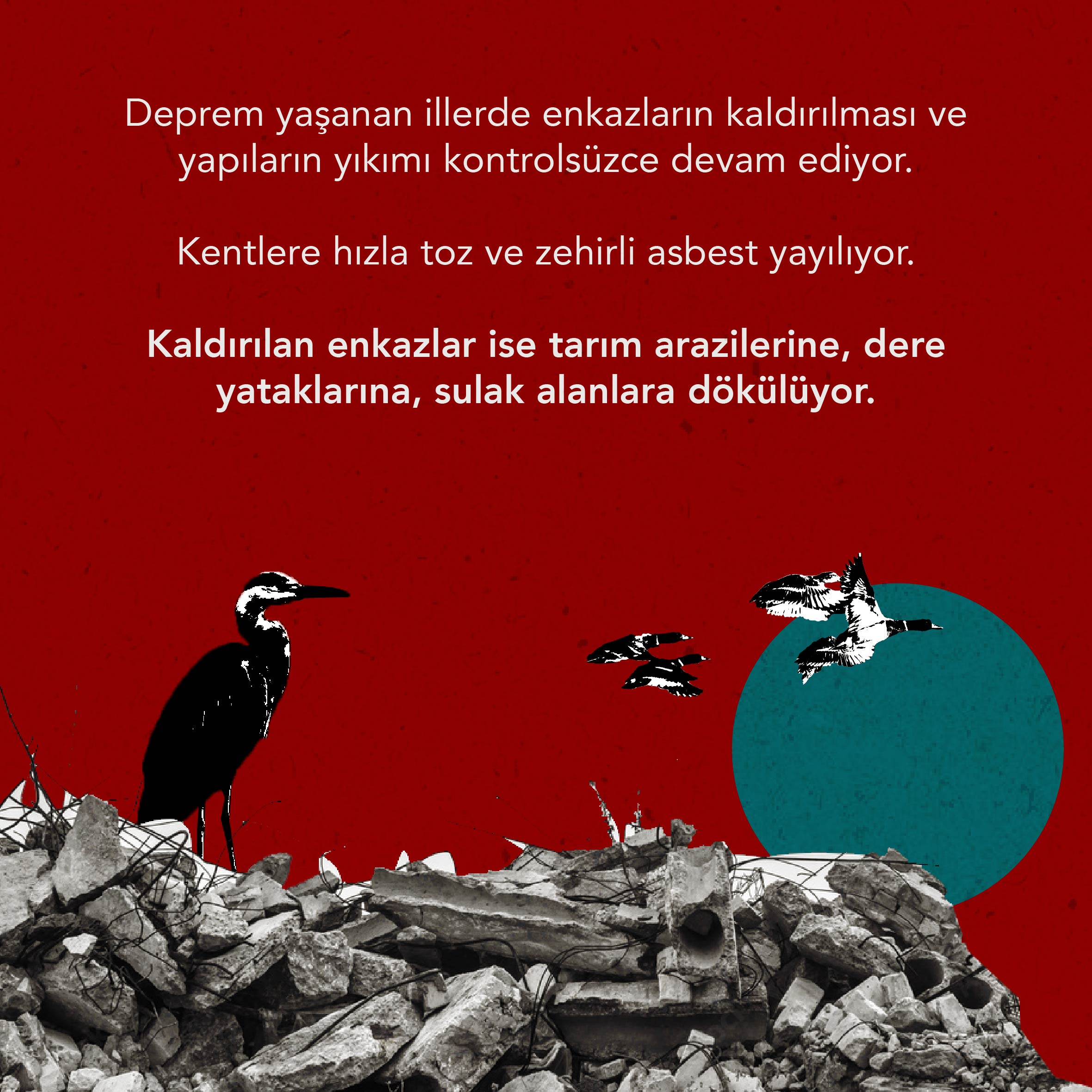 Deprem yaşanan illerde enkazların kaldırılması ve yapıların yıkımı kontrolsüzce devam ediyor. Kentlere hızla toz ve zehirli asbest yayılıyor. Kaldırılan enkazlar ise tarım arazilerine, dere yataklarına, sulak alanlara dökülüyor.