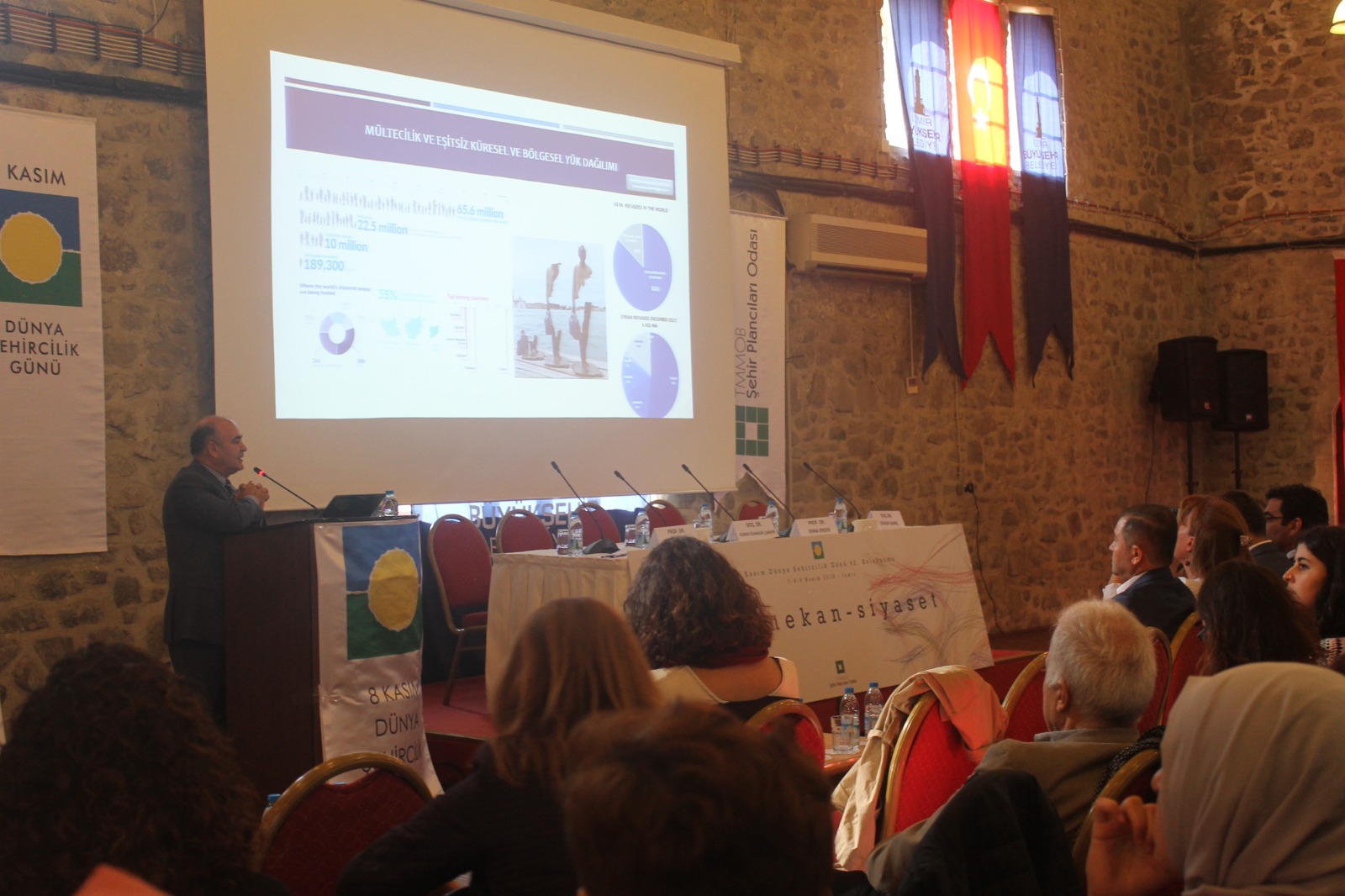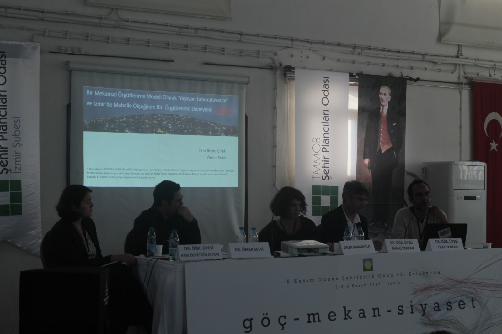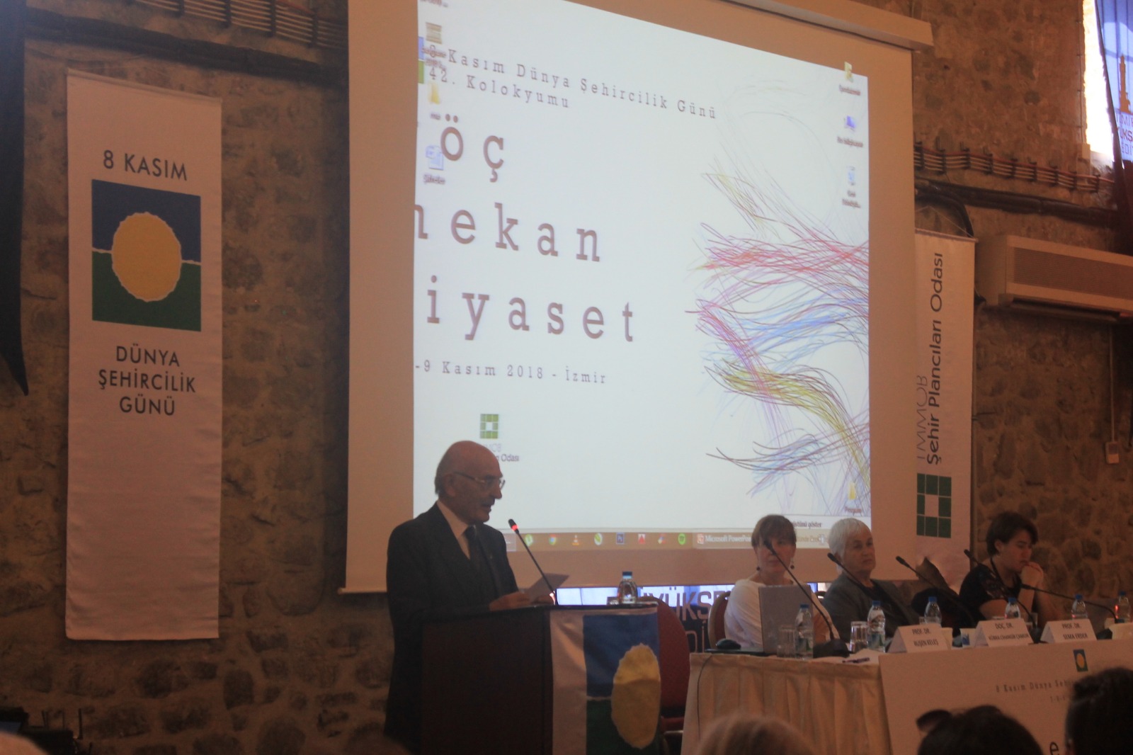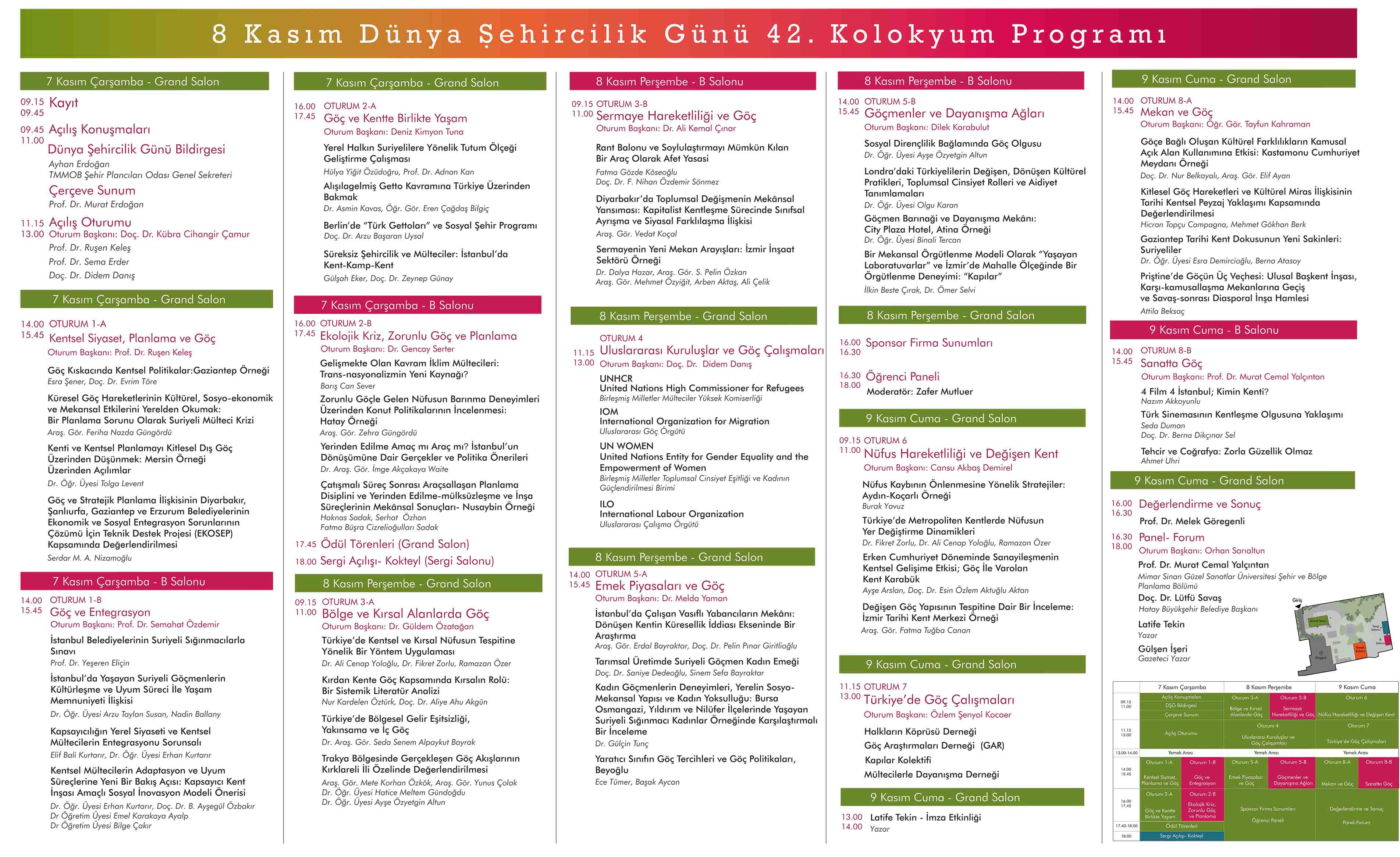 8 Kasım Dünya Şehircilik Günü kapsamında bu yıl 42.sini düzenlediğimiz Dünya Şehircilik Günü Kolokyumu "Göç-Mekan-Siyaset" temasıyla İzmir Havagazı Fabrikası Kültür Merkezi`nde gerçekleşmiştir. Üç gün boyunca devam eden kolokyumda panellerin yanı sıra toplam 46 sunuş gerçekleştirilmiştir. Kolokyumun ilk günü; "Açılış Konuşmaları", "DŞG Bildirgesinin sunulması", "Çerçeve Sunum", "Açılış Oturumu", "Kentsel Siyaset, Planlama ve Göç", "Göç ve Entegrasyon", "Göç ve Kentte Birlikte Yaşam", Ekolojik Kriz, Zorunlu Göç ve Planlama" oturumları ikinci günü; "Bölge ve Kırsal Alanlarda Göç", "Sermaye Hareketliliği ve Göç", "Uluslararası Kuruluşlar ve Göç Çalışmaları", "Emek Piyasaları ve Göç", "Göçmenler ve Dayanışma Ağları", Sponsor Firma Sunumları ve Kolokyum kapsamında düzenlenen öğrenci çalıştayı çalışmalarının sunulduğu Öğrenci Paneli gerçekleştirilmiştir. Kolokyumun son günü ise; "Nüfus Hareketliliği ve Değişen Kent", "Türkiye`de Göç Çalışmaları", "Mekan ve Göç", "Sanatta Göç" oturumlarının ardından "Değerlendirme ve Sonuç" ve "Panel -Forum" ile son bulmuştur.