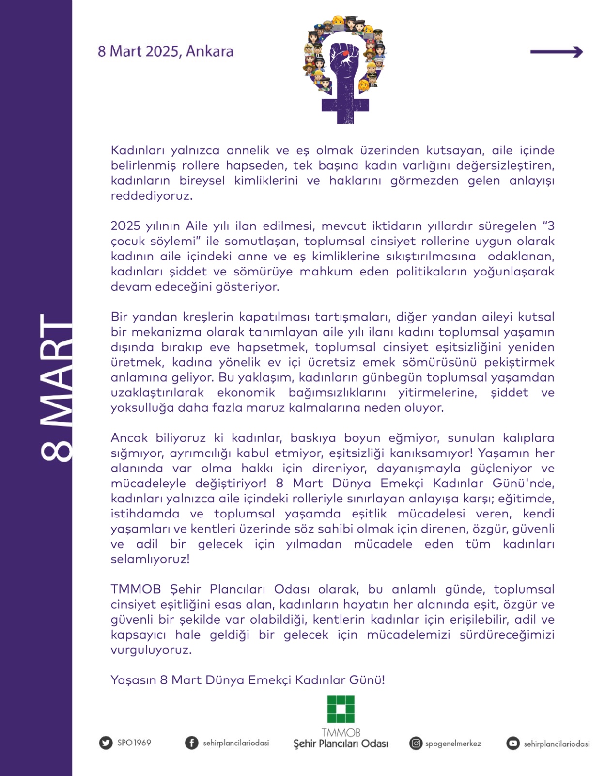 TMMOB Şehir Plancıları Odası olarak, bu anlamlı günde, toplumsal cinsiyet eşitliğini esas alan, kadınların hayatın her alanında eşit, özgür ve güvenli bir şekilde var olabildiği, kentlerin kadınlar için erişilebilir, adil ve kapsayıcı hale geldiği bir gelecek için mücadelemizi sürdüreceğimizi vurguluyoruz.
