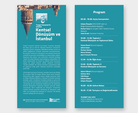 19 Şubat 2013 Salı günü Mimar Sinan Güzel Sanatlar Üniversitesi Mimarlık Fakültesi Şehir ve Bölge Planlama Bölümü ve Ev ve Şehir Vakfı tarafından, MSGSÜ MF Video Konferans Salonu‘nda "Kentsel Dönüşüm ve İstanbul" başlıklı bir toplantı gerçekleştirilecektir. Turgut Cansever anısına gerçekleştirilecek toplantıya ilişkin program ve afiş aşağıda yer almaktadır.