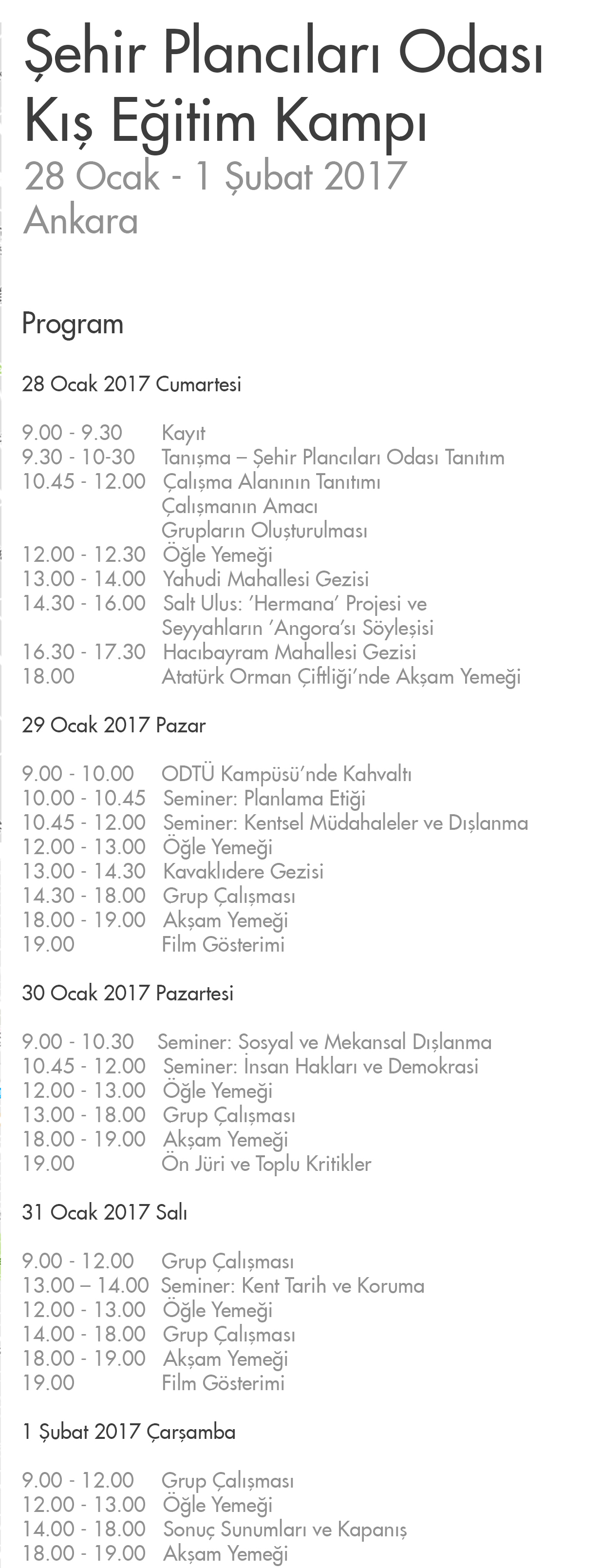 28 OCAK -1 ŞUBAT tarihleri arasında Ankara‘da gerçekleştirilecek olan Şehir Plancıları Odası Kış Eğitim Kampı‘nın programı ektedir.