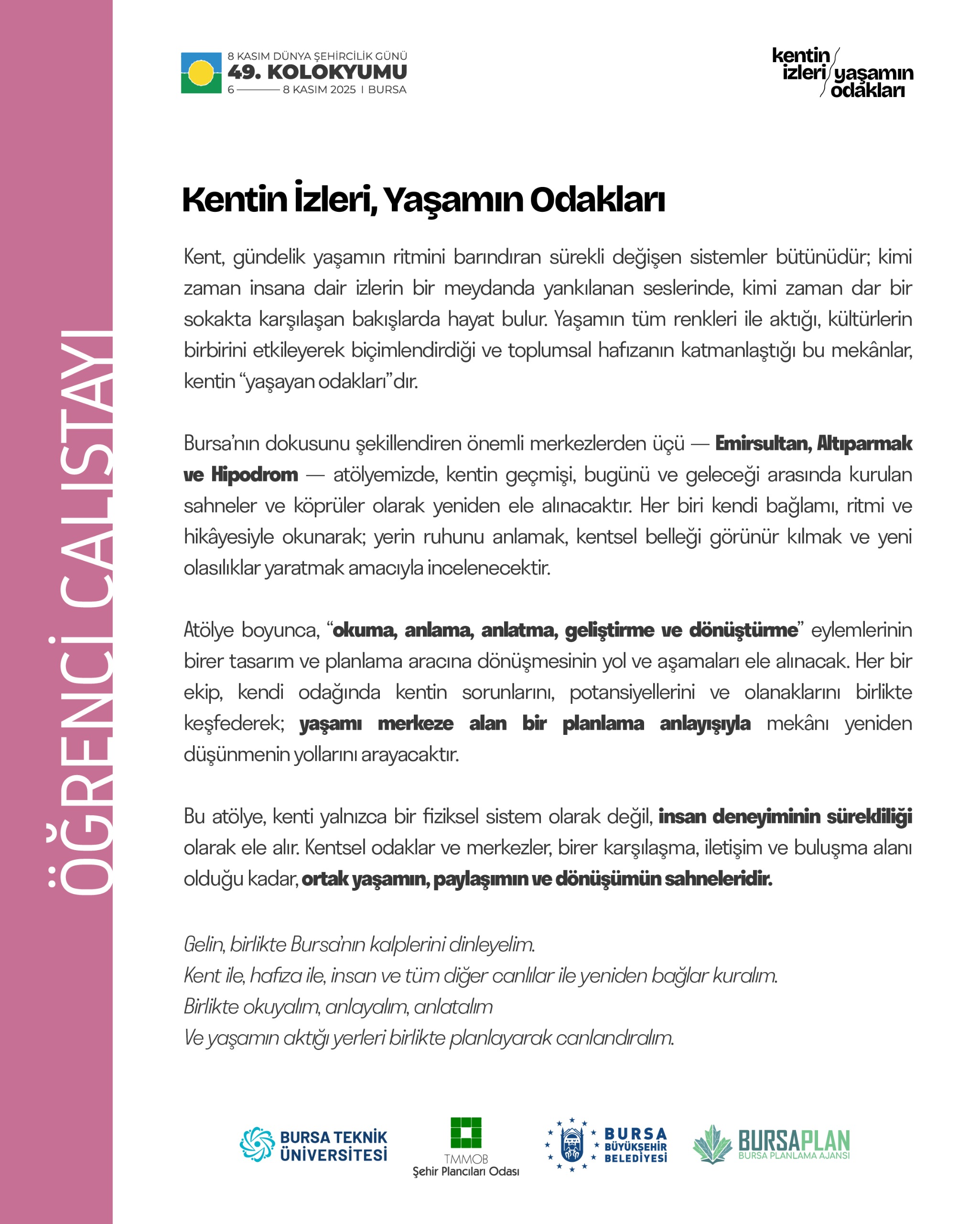 Bursa`nın dokusunu şekillendiren önemli merkezlerden üçü — Emirsultan, Altıparmak ve Hipodrom — atölyemizde, kentin geçmişi, bugünü ve geleceği arasında kurulan sahneler ve köprüler olarak yeniden ele alınacaktır. Her biri kendi bağlamı, ritmi ve hikâyesiyle okunarak; yerin ruhunu anlamak, kentsel belleği görünür kılmak ve yeni olasılıklar yaratmak amacıyla incelenecektir.