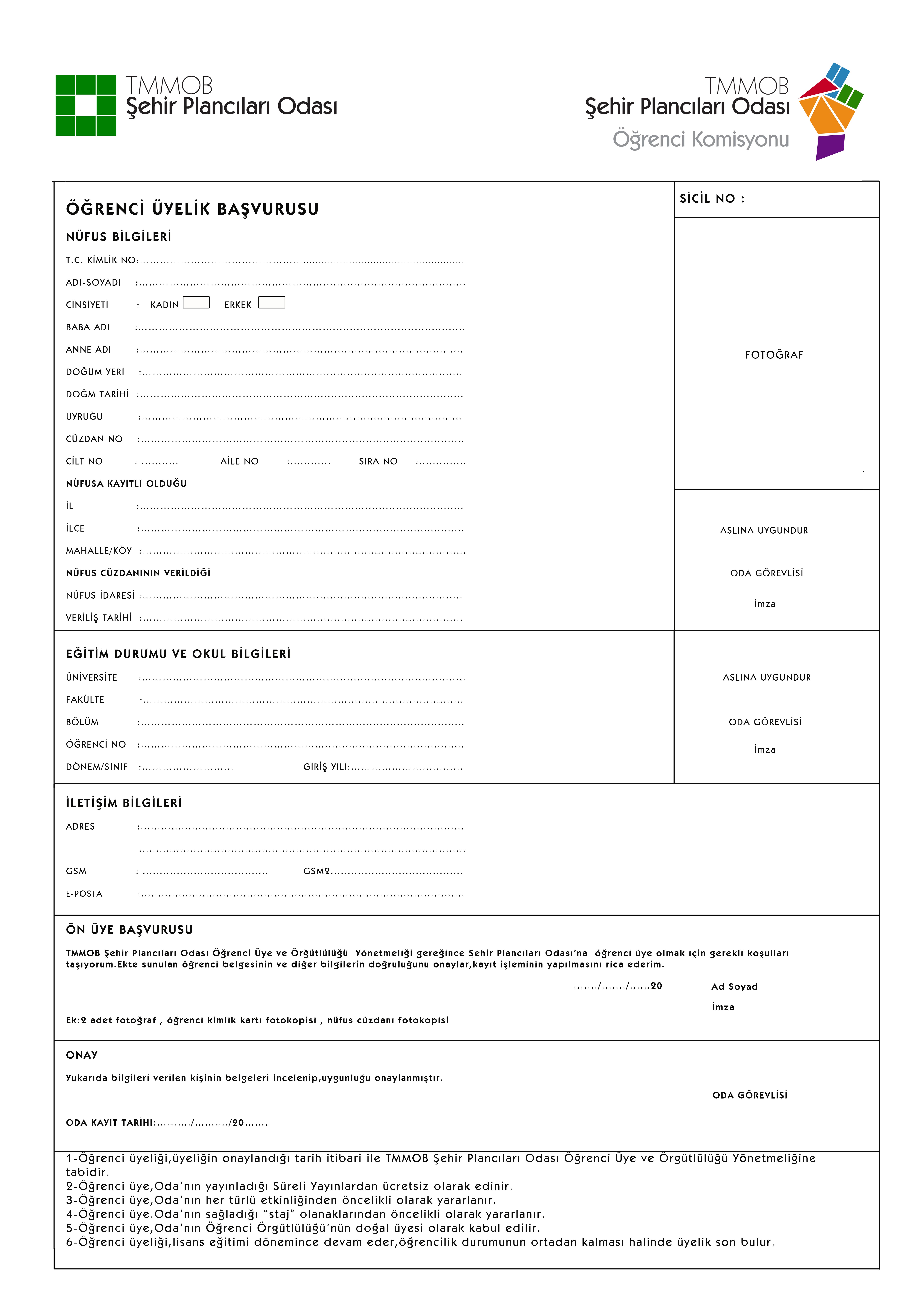 ÖĞRENCİ ÜYELİK İÇİN GEREKLİ EVRAKLAR;