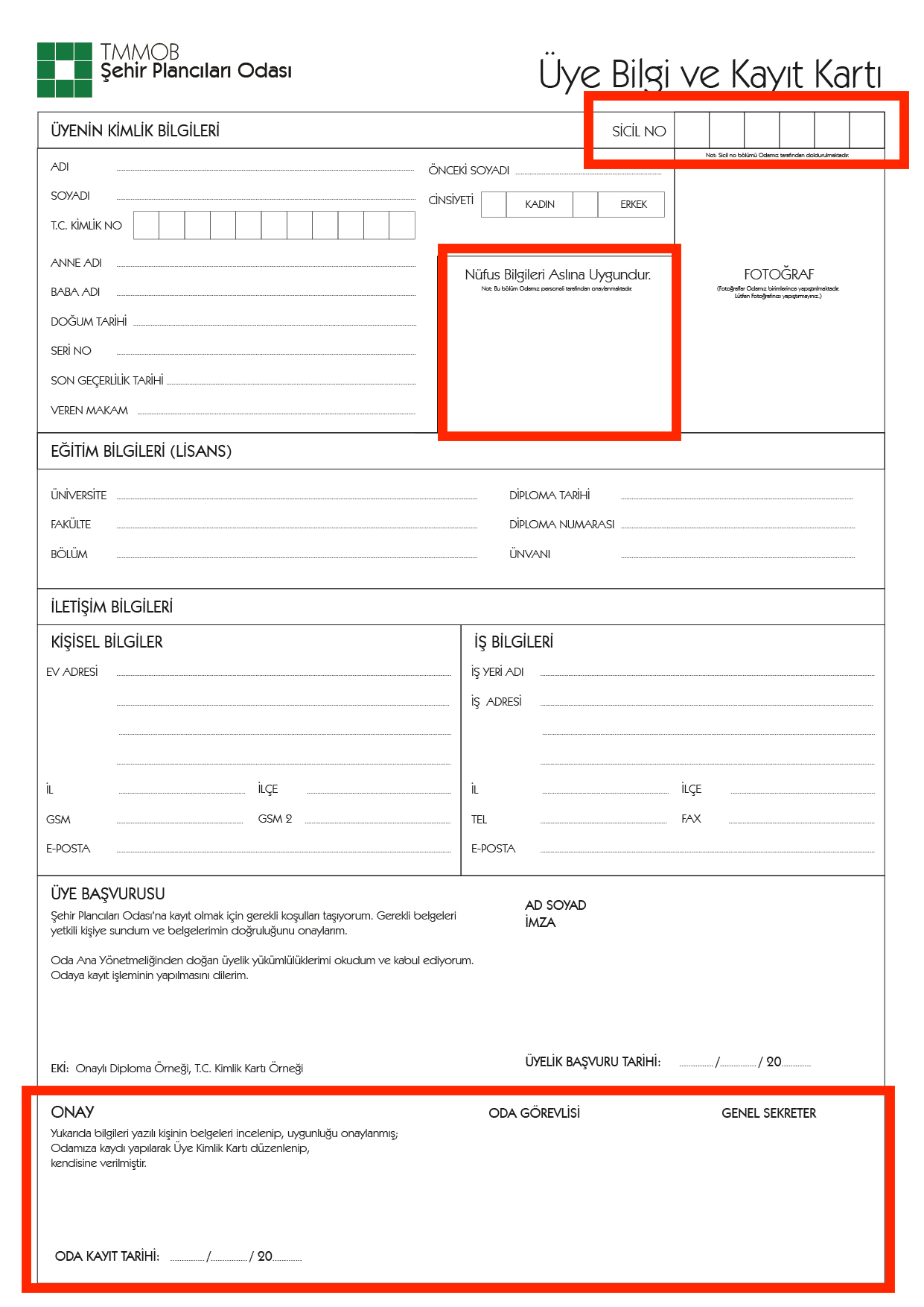 1. TMMOB Şehir Plancıları Odası Üye Bilgi Ve Kayıt Kartı (Şube/temsilcilikten temin edilmektedir.)