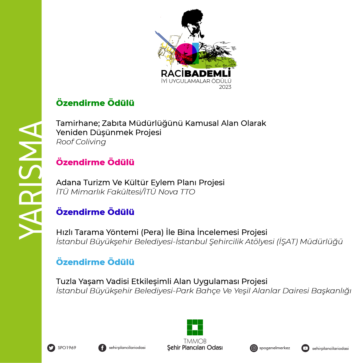TMMOB Şehir Plancıları Odası tarafından, 01.09.2003 tarihinde kaybettiğimiz değerli hocamız Prof. Dr. Raci Bademli anısına ilk olarak 2003 yılında düzenlenen ve iki yılda bir tekrarlanan Raci Bademli İyi Uygulamalar Ödülü Yarışması`nın bu yıl 11`incisini düzenlenmiştir. Yarışma çağrısı kapsamındaki jüri değerlendirme toplantısı 6 Ekim 2023 tarihinde 19.00-21.30 saatleri arasında çevrimiçi gerçekleştirilmiştir.