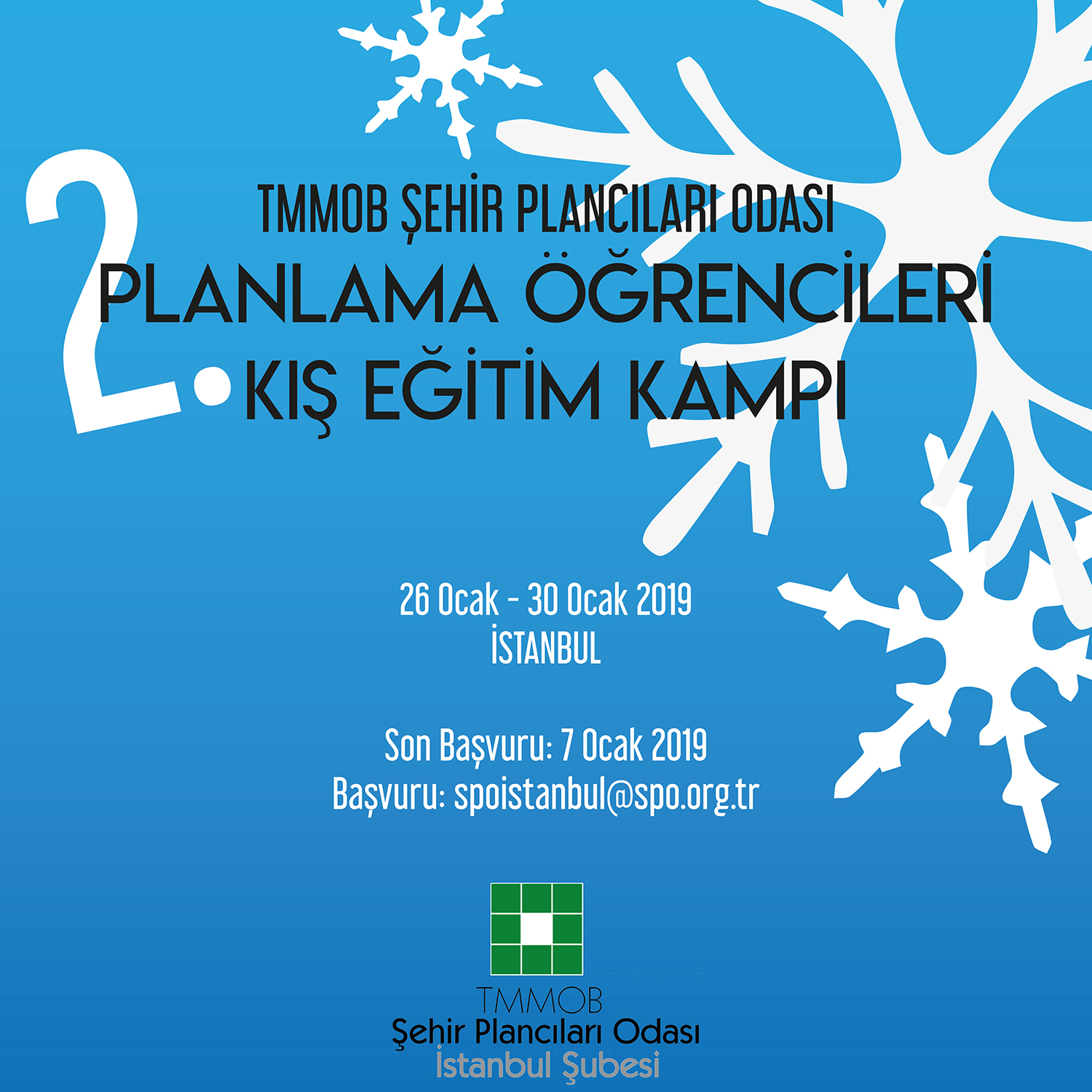 Bu yıl ikincisi düzenlenecek olan Planlama Öğrencileri Kış Eğitim Kampı 26 Ocak - 30 Ocak 2019 tarihlerinde İstanbul`da gerçekleştirilecektir. Sınırlı kontenjanla gerçekleştirilecek olan Kış Eğitim Kampı`na katılmak isteyen Şehir ve Bölge Planlama Öğrencilerinin ekteki formu doldurduktan sonra 7 Ocak 2019`a kadar spoistanbul@spo.org.tr adresine göndermeleri gerekmektedir. Başvurular arasından yapılacak olan değerlendirmelerin sonuçları 9 Ocak 2019 tarihinde www.spoist.org web sitesinden duyurulacaktır.