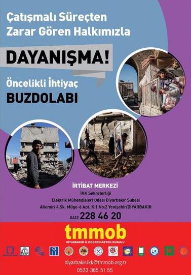 TMMOB Diyarbakır İl Koordinasyon Kurulu çatışma sürecinde zarar gören halkla dayanışma için kampanya başlattı. TMMOB Diyarbakır İKK, öncelikli ihtiyaç olan buzdolabı alımı için desteklerinizi bekliyor.