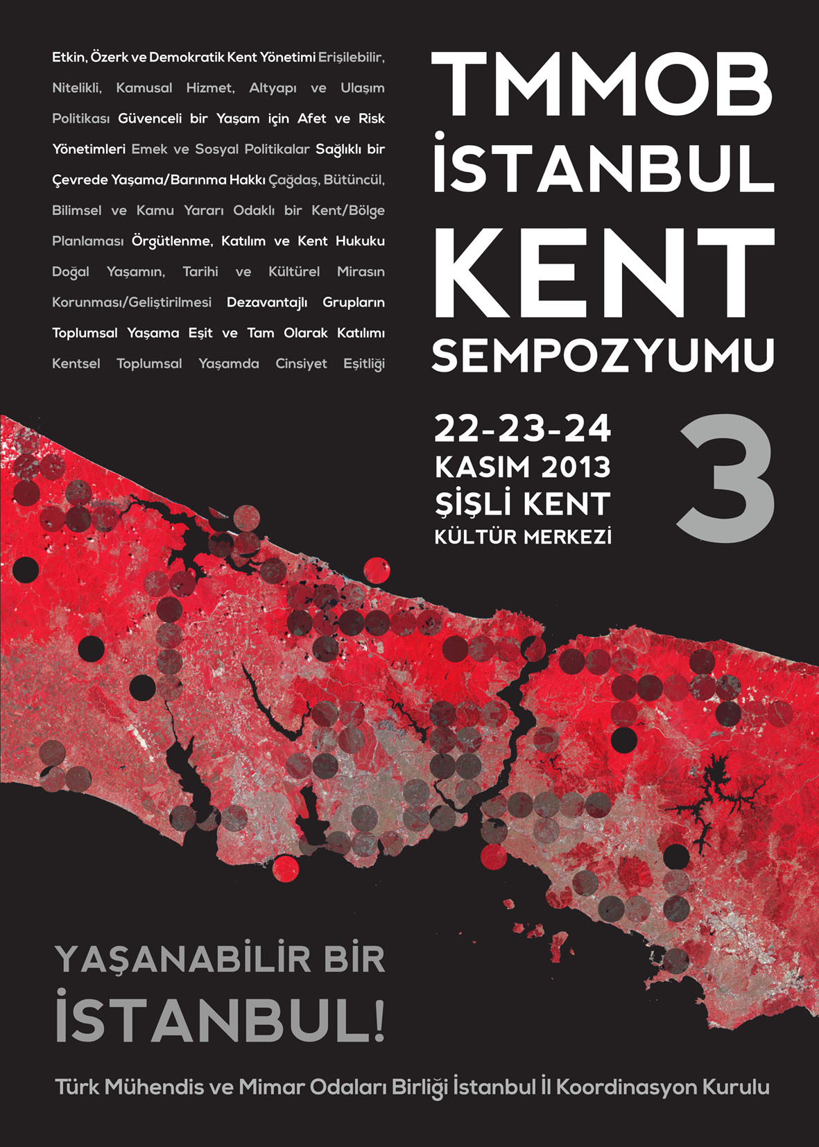 Türk Mühendis ve Mimar Odaları Birliği olarak tüm yaşam alanlarımıza ve kamuya yönelik yağma politikalarına karşı bilimden, demokrasinden ve doğadan yana yıllardır yürüttüğümüz mücadele ekseninde bu yıl üçüncüsü düzenlenecek olan İstanbul Kent Sempozyumu "İnsanca, Yaşanabilir Bir Kent"in mümkün ve hakkımız olduğunu ortaya koymayı amaçlamaktadır. Bu amaç çerçevesinde düzenlenecek sempozyum, yerel seçimler öncesinde; toplumcu, eşitlikçi, doğadan ve bilimden yana; söz, yetki ve karar alma süreçlerini demokratikleştiren bir kent yaşamının örgütlenebilmesi yolunda önemli bir adım olabilecektir. İstanbul`un başıboş ve bütünsellikten uzak bir şekilde küresel ve yerel sermayenin saldırgan talepleri ile şekillendirildiği bu süreçte Yaşanabilir Bir İstanbul`un mücadelesinin fikrî temelleri TMMOB`nin bileşenlerinin yanı sıra, tüm bu kentleşme süreçlerinden etkilenen ilgili kesimler; üniversiteler, sendikalar, demokratik toplum örgütleri, forumlar, yerel inisiyatif ve mahalle örgütlenmeleri dahil edilerek sağlamlaştırılmaya çalışılacaktır.