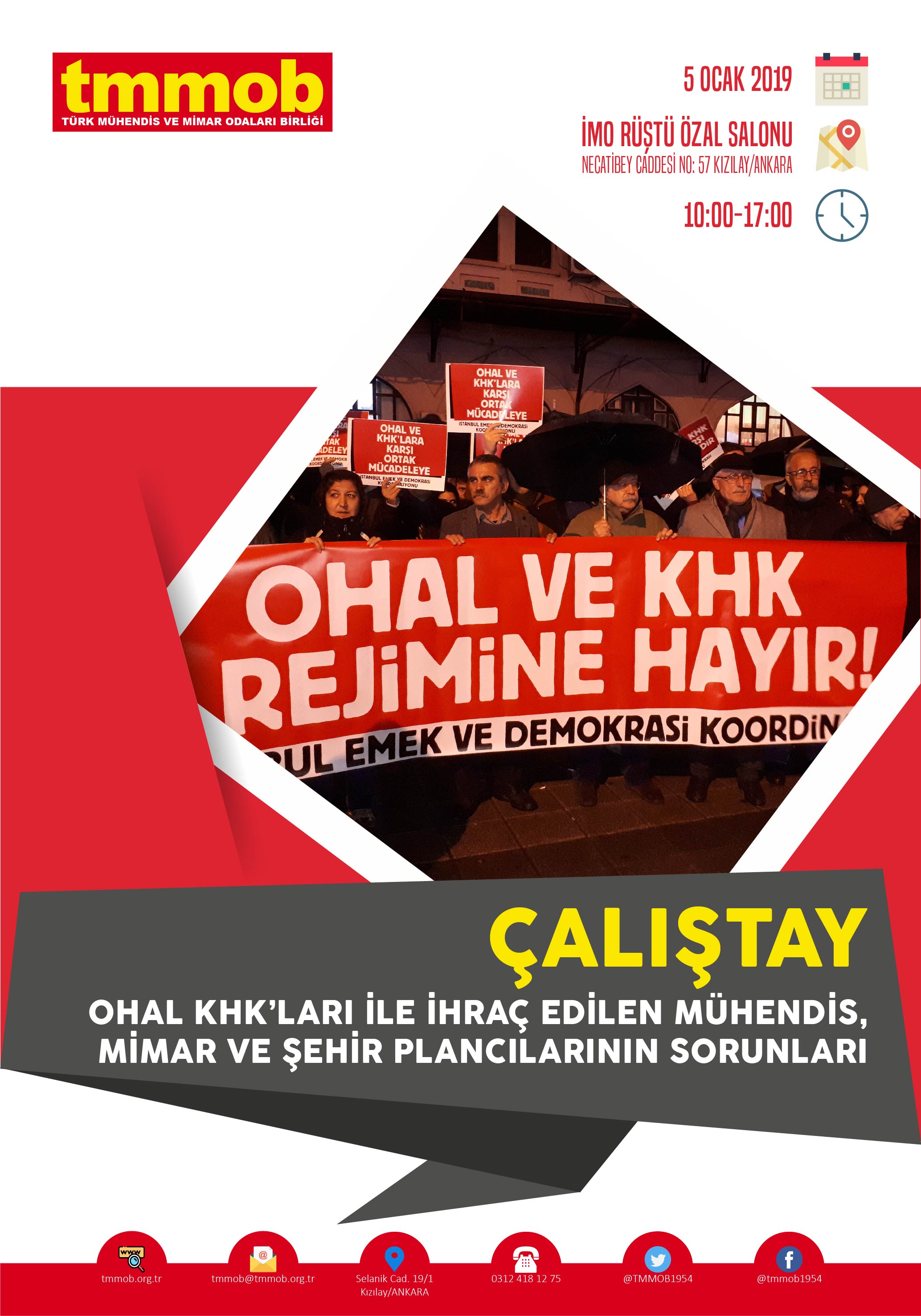 TMMOB OHAL KHK`ları İle İhraç Edilen Mühendis, Mimar ve Şehir Plancılarının Sorunları başlıklı Çalıştay 5 Ocak 2019 Cumartesi günü İnşaat Mühendisleri Odası Rüştü Özal Salonunda(Necatibey Caddesi No:57 Kızılay-Ankara) düzenlenecektir.