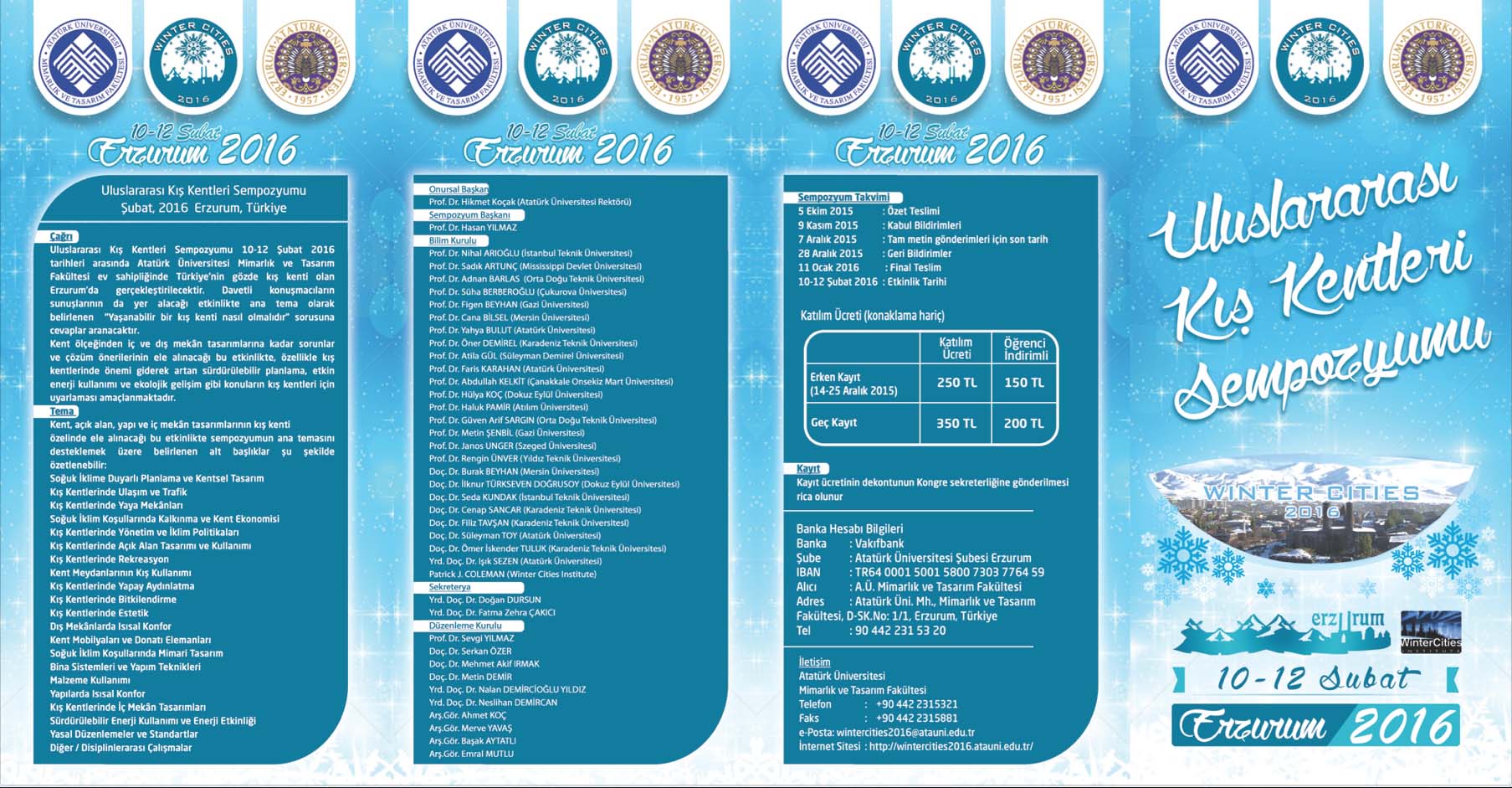 Uluslararası Kış Kentleri Sempozyumu 10-12 Şubat 2016 tarihleri arasında Atatürk Üniversitesi Mimarlık ve Tasarım Fakültesi ev sahipliğinde Erzurum`da gerçekleştirilecektir. Davetli konuşmacıların sunumlarının da yer alacağı etkinlikte ana tema olarak belirlenen " Yaşanabilir bir kış kenti nasıl olmalıdır" sorusuna cevap aranacaktır.