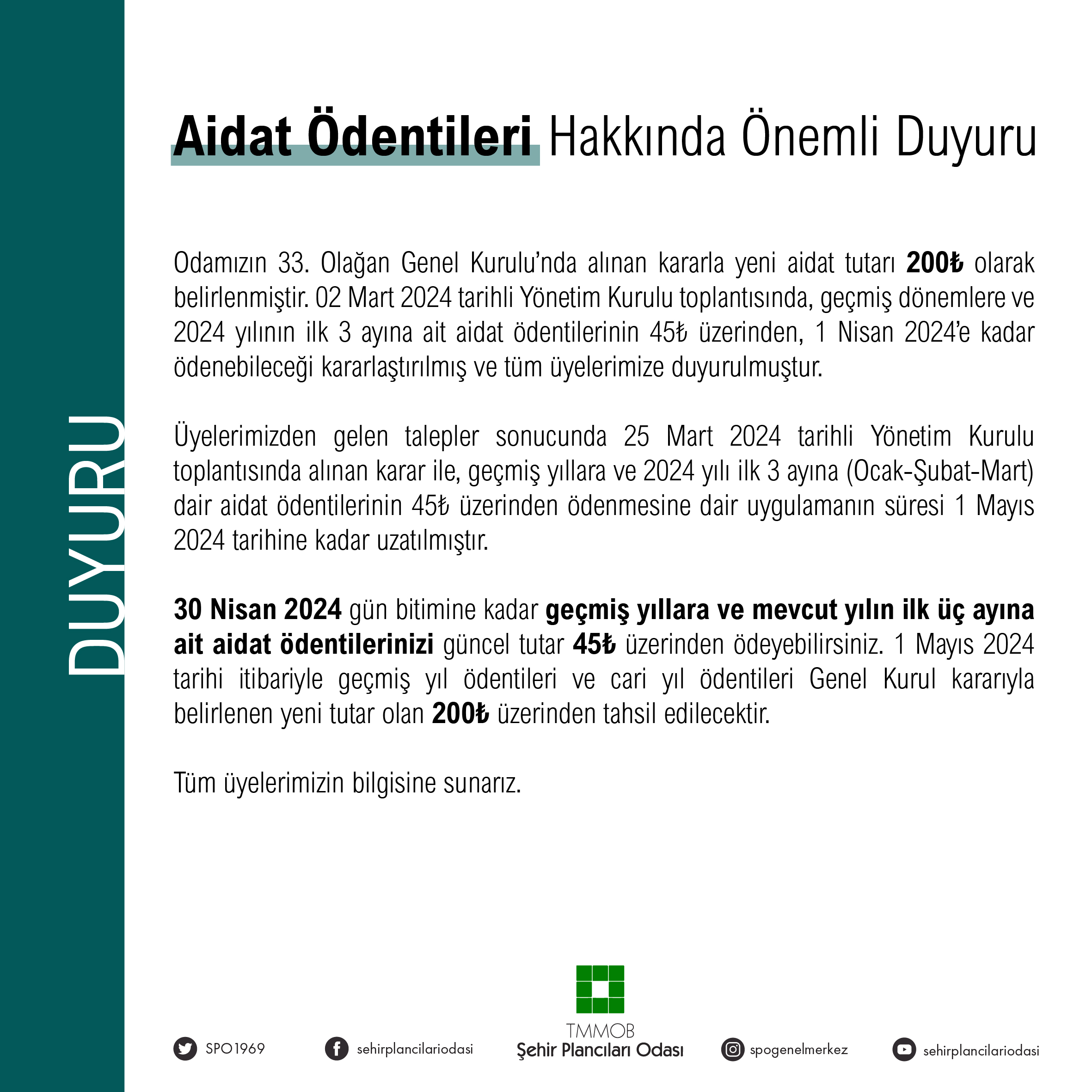 Üyelerimizden gelen talepler sonucunda 25 Mart 2024 tarihli Yönetim Kurulu toplantısında alınan karar ile, geçmiş yıllara ve 2024 yılı ilk 3 ayına (Ocak-Şubat-Mart) dair aidat ödentilerinin 45₺ üzerinden ödenmesine dair uygulamanın süresi 1 Mayıs 2024 tarihine kadar uzatılmıştır.