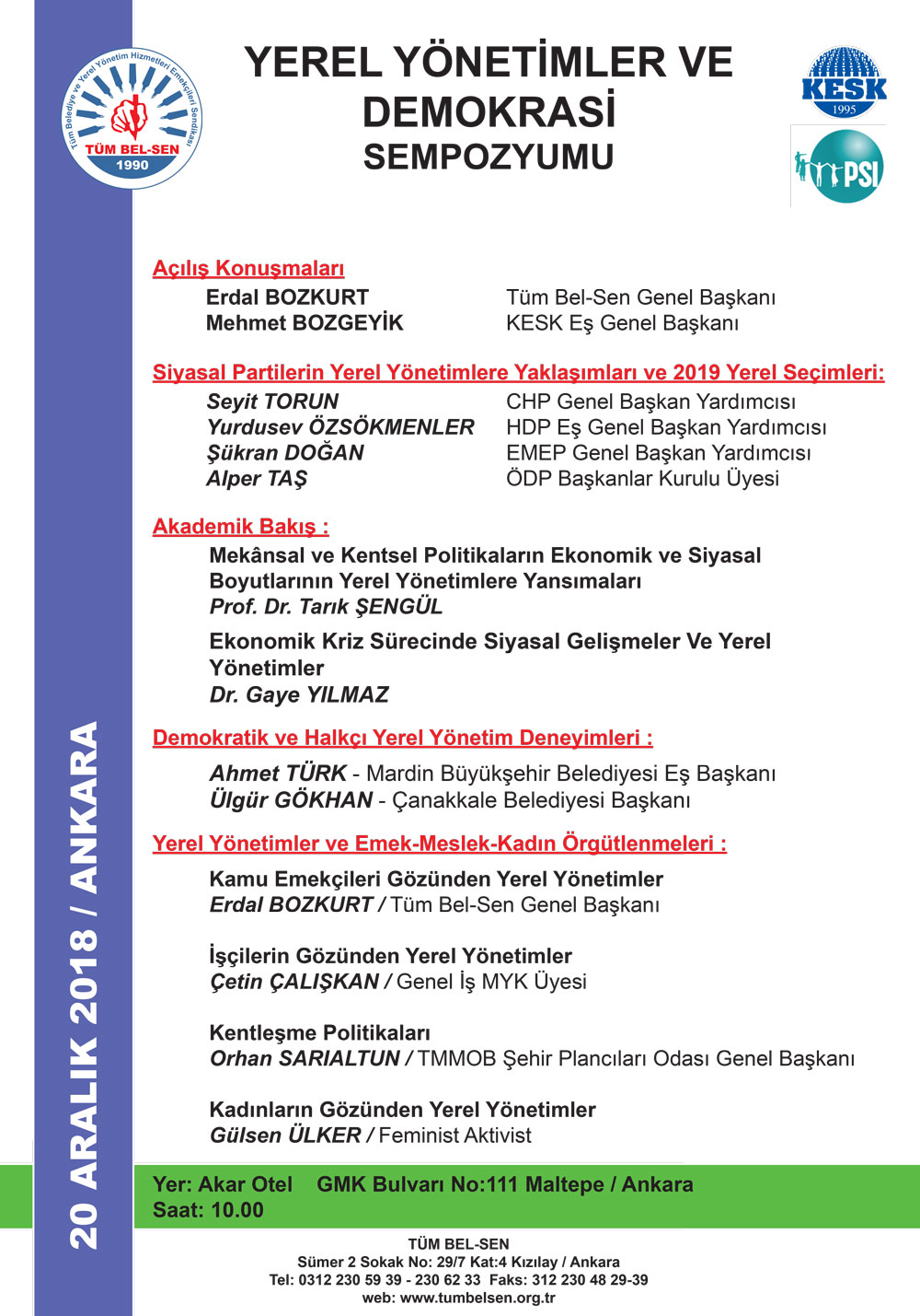 Sekreteryası TÜM BEL-SEN tarafından yürütülen ve Odamız Genel Başkanı Orhan Sarıaltun`un "Kentleşme Politikaları" başlıklı bir sunuş ile katkı koyacağı Yerel Yönetimler ve Demokrasi Sempozyumu 20 Aralık 2018 Perşembe günü saat 10.00‘da, Akar Otel`de (GMK Bulvarı No:111 Maltepe-Ankara) düzenlenecektir.
