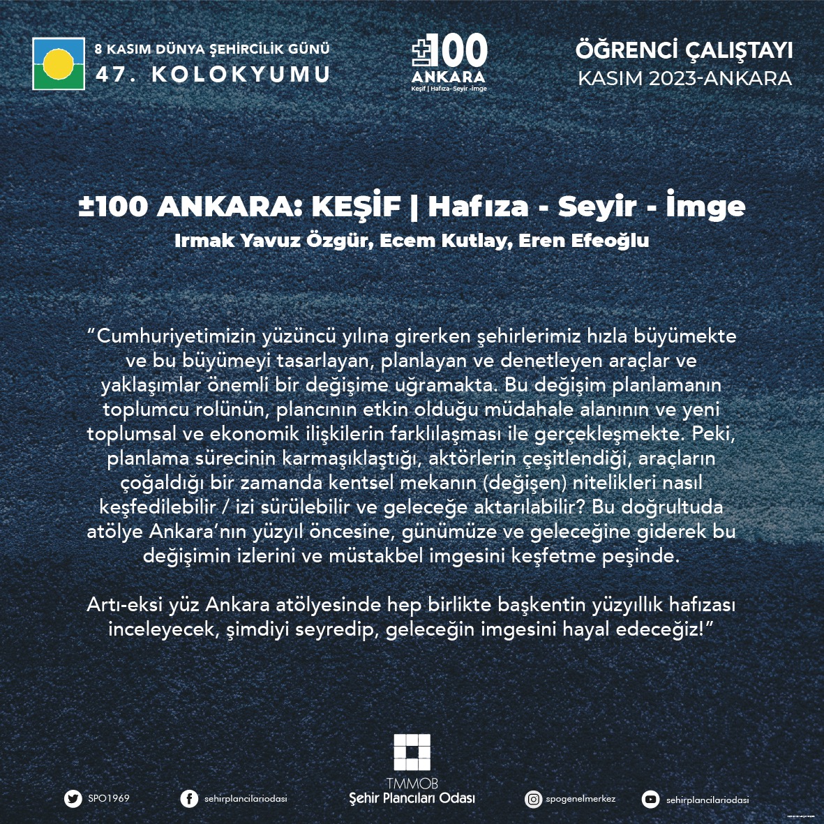 "Cumhuriyetimizin yüzüncü yılına girerken şehirlerimiz hızla büyümekte ve bu büyümeyi tasarlayan, planlayan ve denetleyen araçlar ve yaklaşımlar önemli bir değişime uğramakta. Bu değişim planlamanın toplumcu rolünün, plancının etkin olduğu müdahale alanının ve yeni toplumsal ve ekonomik ilişkilerin farklılaşması ile gerçekleşmekte. Peki, planlama sürecinin karmaşıklaştığı, aktörlerin çeşitlendiği, araçların çoğaldığı bir zamanda kentsel mekanın (değişen) nitelikleri nasıl keşfedilebilir / izi sürülebilir ve geleceğe aktarılabilir? Bu doğrultuda atölye Ankara`nın yüzyıl öncesine, günümüze ve geleceğine giderek bu değişimin izlerini ve müstakbel imgesini keşfetme peşinde.