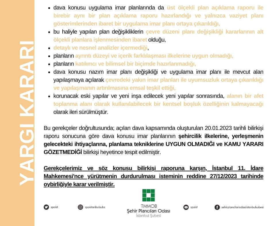 Gerekçelerimiz ve söz konusu bilirkişi raporuna karşın, İstanbul 11. İdare Mahkemesi‘nce yürütmenin durdurulması isteminin reddine 27/12/2023 tarihinde oybirliğiyle karar verilmiştir.