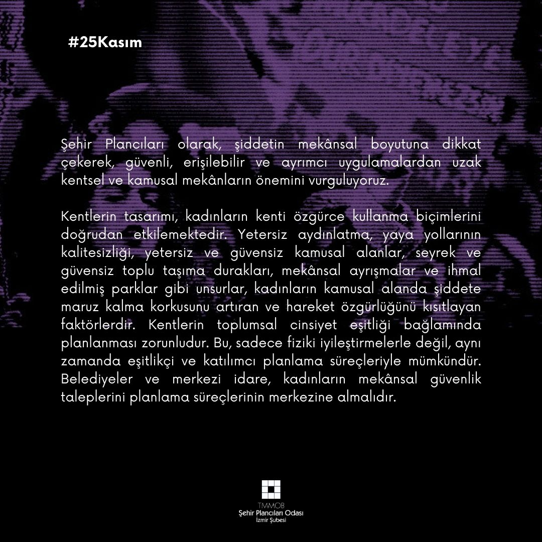 TMMOB Şehir Plancıları Odası İzmir Şubesi olarak, 25 Kasım Dünya Kadına Yönelik Şiddetle Mücadele Günü`nde; şiddetin temelinde yatan toplumsal cinsiyet eşitsizliğinin, önleyici ve koruyucu politikaların eksikliğinin ve cezasızlığın, tablonun derinleşmesine yol açtığını beyan ediyoruz.