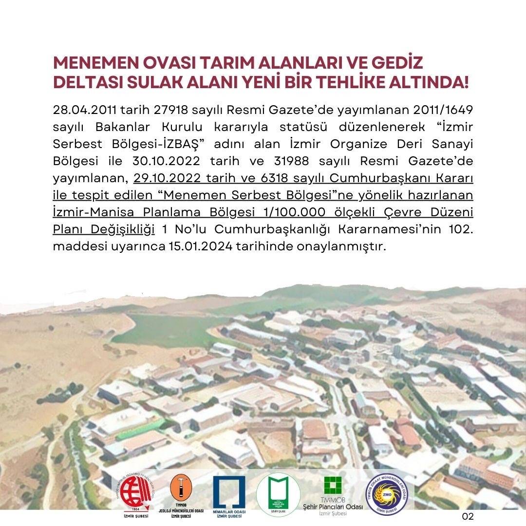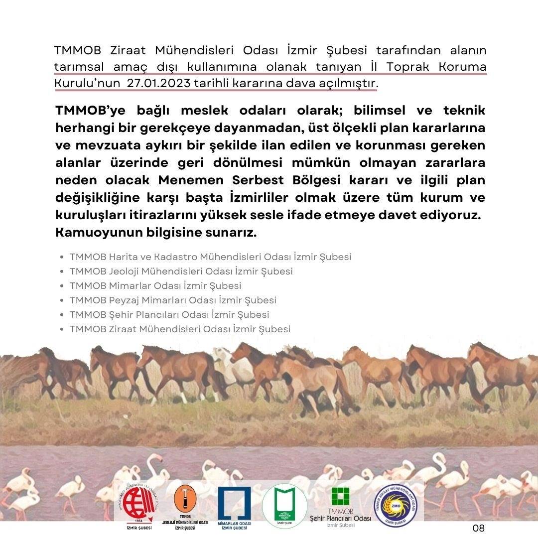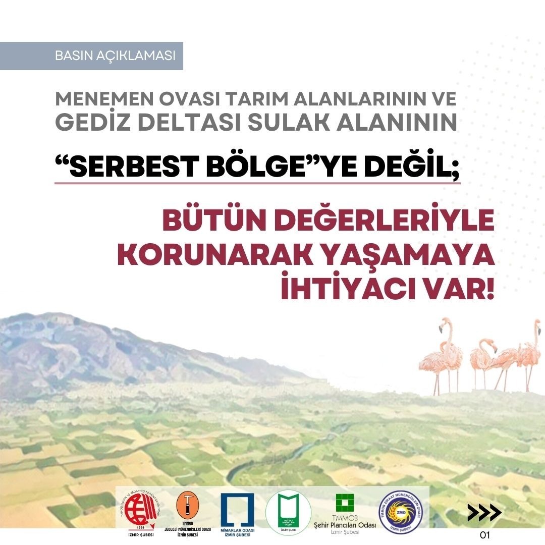TMMOB`ye bağlı meslek odaları olarak; bilimsel ve teknik herhangi bir gerekçeye dayanmadan, üst ölçekli plan kararlarına ve mevzuata aykırı bir şekilde ilan edilen ve korunması gereken alanlar üzerinde geri dönülmesi mümkün olmayan zararlara neden olacak Menemen Serbest Bölgesi kararı ve ilgili plan değişikliğine karşı başta İzmirliler olmak üzere tüm kurum ve kuruluşları itirazlarını yüksek sesle ifade etmeye davet ediyoruz.