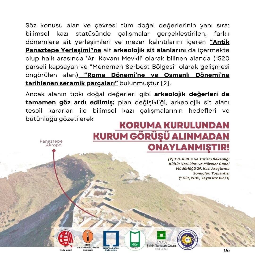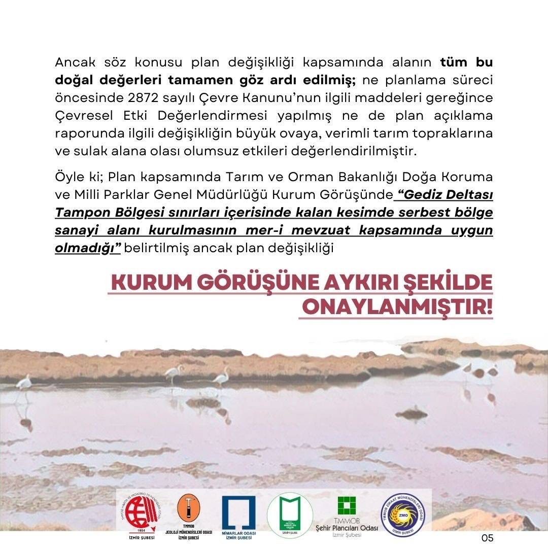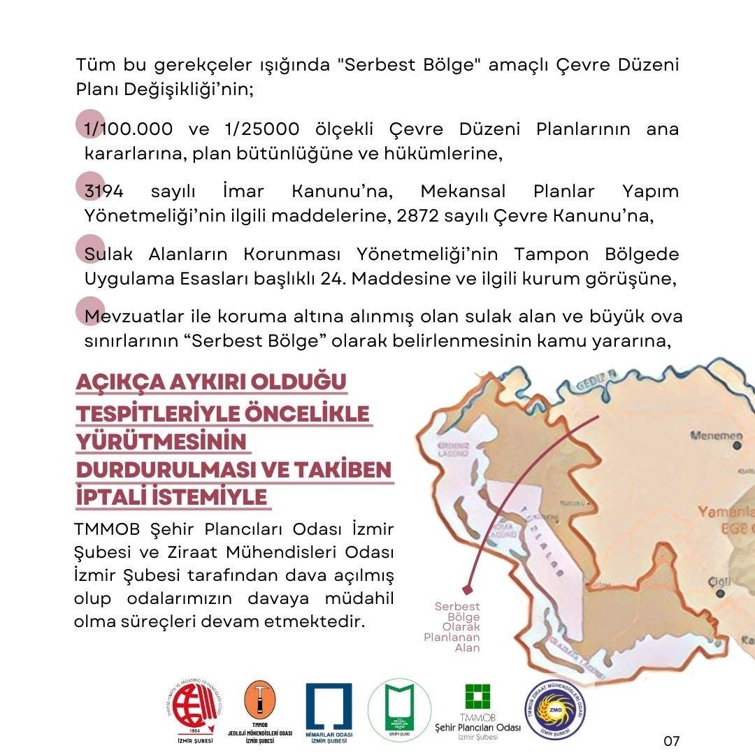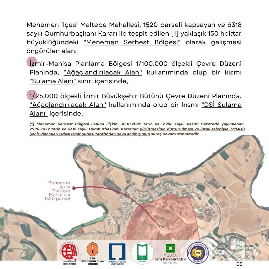 TMMOB`ye bağlı meslek odaları olarak; bilimsel ve teknik herhangi bir gerekçeye dayanmadan, üst ölçekli plan kararlarına ve mevzuata aykırı bir şekilde ilan edilen ve korunması gereken alanlar üzerinde geri dönülmesi mümkün olmayan zararlara neden olacak Menemen Serbest Bölgesi kararı ve ilgili plan değişikliğine karşı başta İzmirliler olmak üzere tüm kurum ve kuruluşları itirazlarını yüksek sesle ifade etmeye davet ediyoruz.