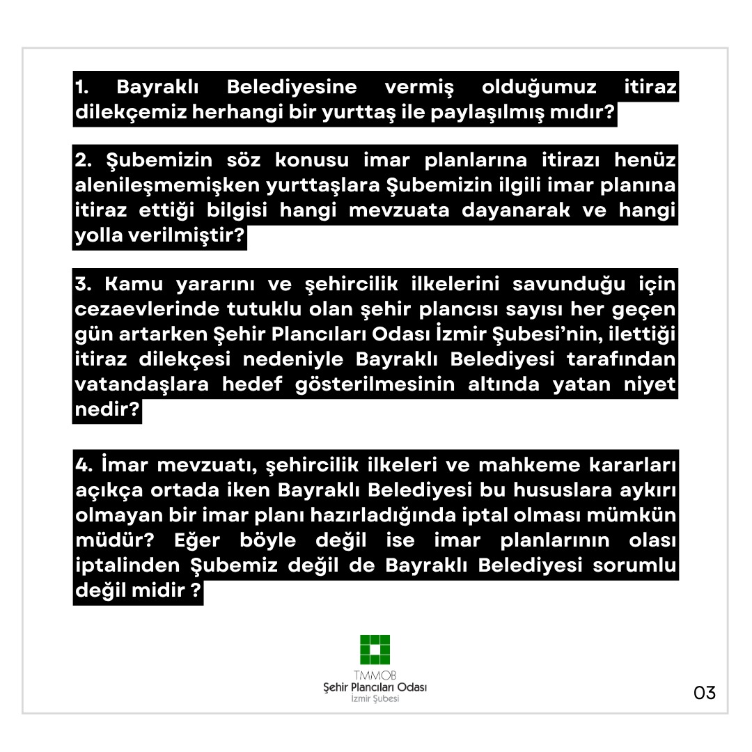 3. Kamu yararını ve şehircilik ilkelerini savunduğu için cezaevlerinde tutuklu olan şehir plancısı sayısı her geçen gün artarken Şehir Plancıları Odası İzmir Şubesi`nin, ilettiği itiraz dilekçesi nedeniyle Bayraklı Belediyesi tarafından vatandaşlara hedef gösterilmesinin altında yatan niyet nedir?