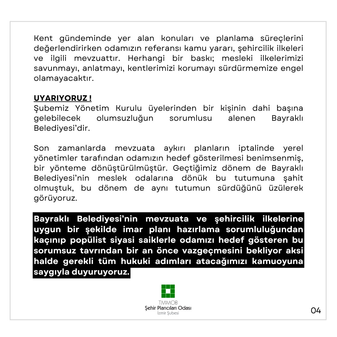 Bayraklı Belediyesi`nin mevzuata ve şehircilik ilkelerine uygun bir şekilde imar planı hazırlama sorumluluğundan kaçınıp popülist siyasi saiklerle odamızı hedef gösteren bu sorumsuz tavrından bir an önce vazgeçmesini bekliyor aksi halde gerekli tüm hukuki adımları atacağımızı kamuoyuna saygıyla duyuruyoruz.