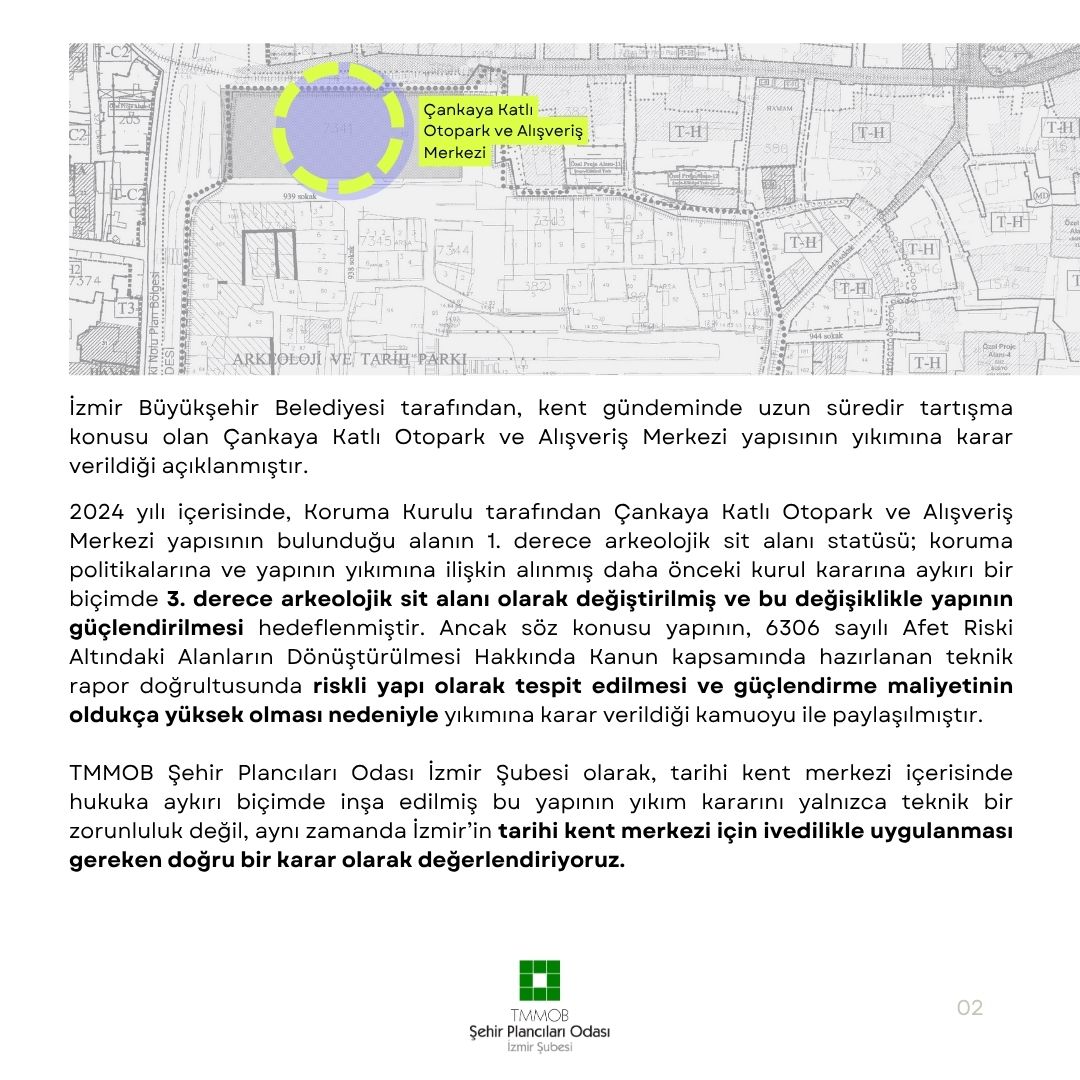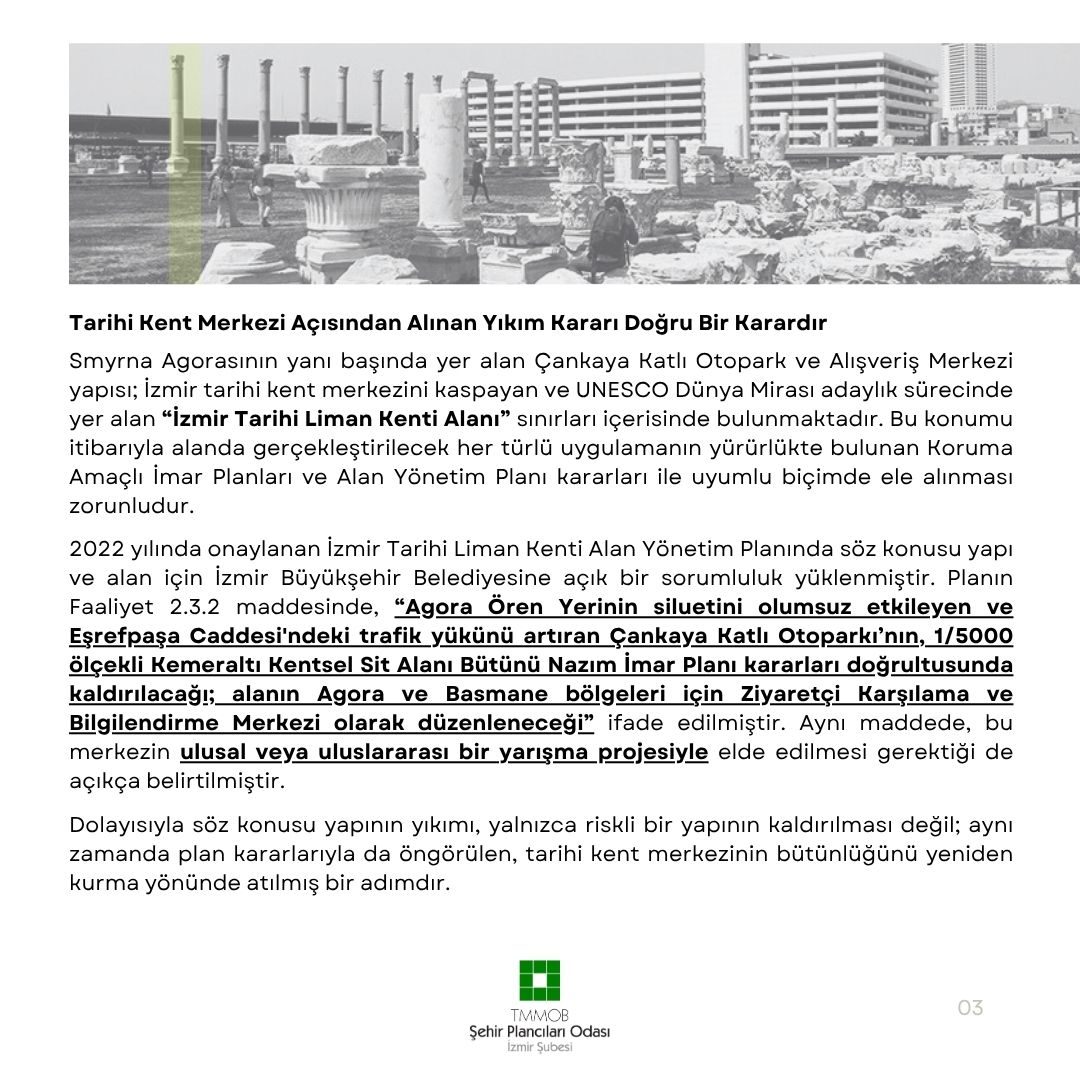 TMMOB Şehir Plancıları Odası İzmir Şubesi olarak, tarihi kent merkezi içerisinde hukuka aykırı biçimde inşa edilmiş bu yapının yıkım kararını yalnızca teknik bir zorunluluk değil, aynı zamanda İzmir`in tarihî kent merkezi için ivedilikle uygulanması gereken doğru bir karar olarak değerlendiriyoruz.
