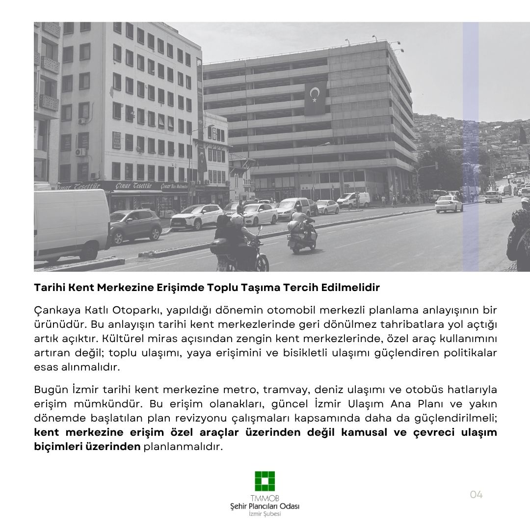 Çankaya Katlı Otoparkı, yapıldığı dönemin otomobil merkezli planlama anlayışının bir ürünüdür. Bu anlayışın tarihi kent merkezlerinde geri dönülmez tahribatlara yol açtığı artık açıktır. Kültürel miras açısından zengin kent merkezlerinde, özel araç kullanımını artıran değil; toplu ulaşımı, yaya erişimini ve bisikletli ulaşımı güçlendiren politikalar esas alınmalıdır.