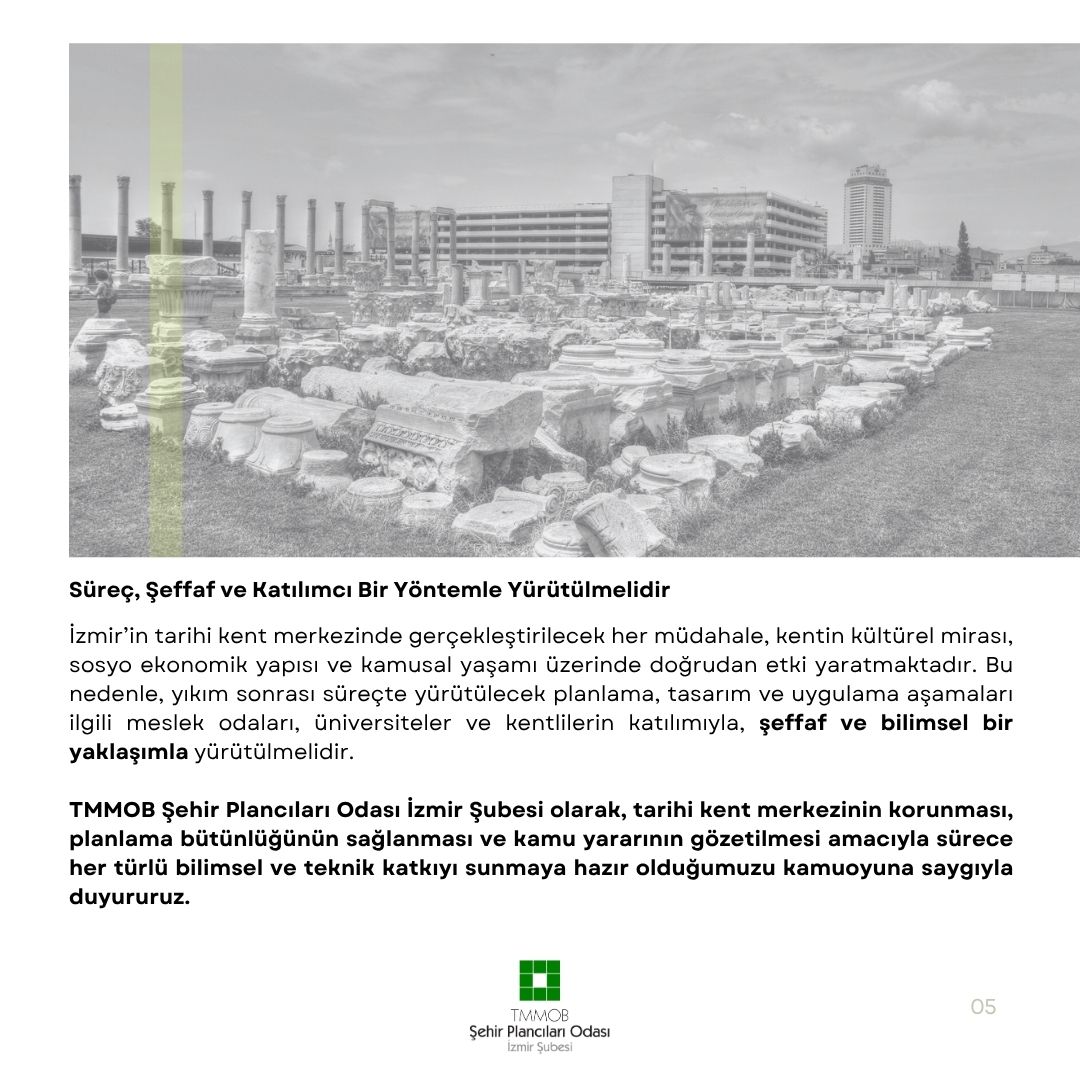 İzmir`in tarihi kent merkezinde gerçekleştirilecek her müdahale, kentin kültürel mirası, sosyo ekonomik yapısı ve kamusal yaşamı üzerinde doğrudan etki yaratmaktadır. Bu nedenle, yıkım sonrası süreçte yürütülecek planlama, tasarım ve uygulama aşamaları ilgili meslek odaları, üniversiteler ve kentlilerin katılımıyla, şeffaf ve bilimsel bir yaklaşımla yürütülmelidir.