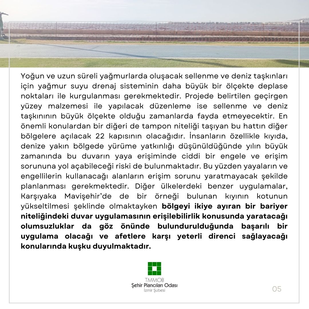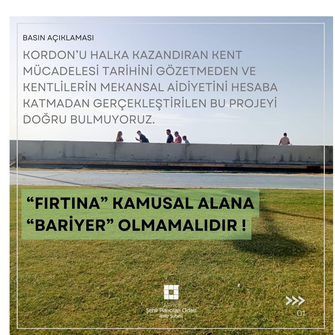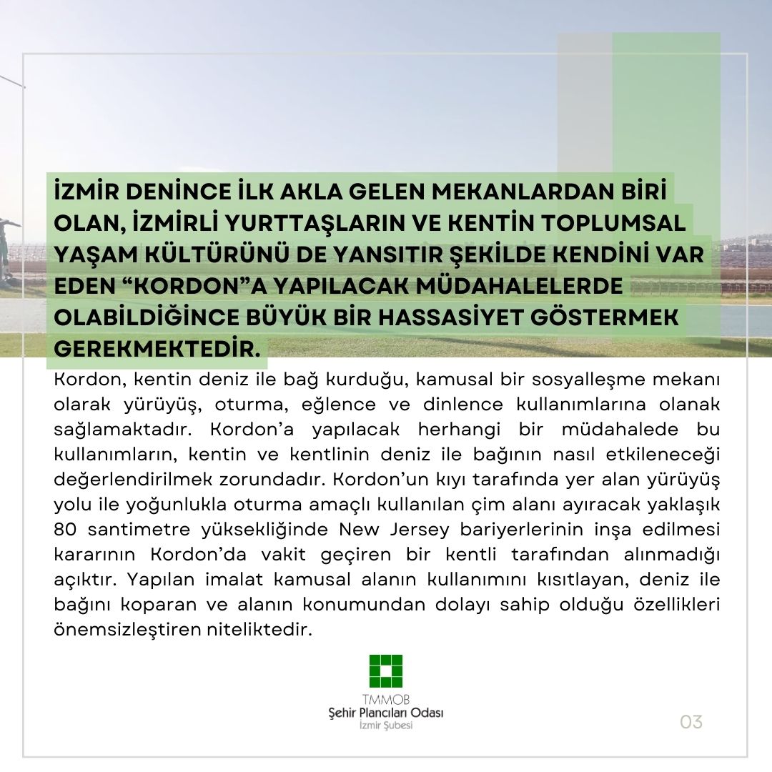 İzmir denince ilk akla gelen mekanlardan biri olan, İzmirli yurttaşların ve kentin toplumsal yaşam kültürünü de yansıtır şekilde kendini var eden "Kordon"a yapılacak müdahalelerde olabildiğince büyük bir hassasiyet göstermek gerekmektedir.