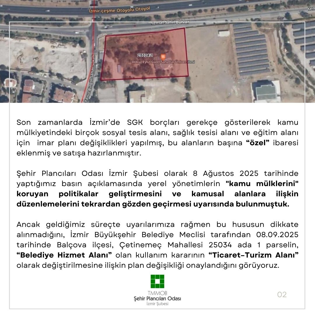 Ancak geldiğimiz süreçte uyarılarımıza rağmen bu hususun dikkate alınmadığını, İzmir Büyükşehir Belediye Meclisi tarafından 08.09.2025 tarihinde Balçova ilçesi, Çetinemeç Mahallesi 25034 ada 1 parselin, "Belediye Hizmet Alanı" olan kullanım kararının "Ticaret–Turizm Alanı" olarak değiştirilmesine ilişkin plan değişikliği onaylandığını görüyoruz.