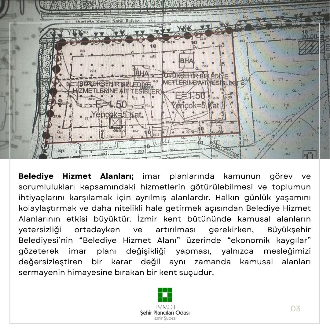 Belediye Hizmet Alanları; imar planlarında kamunun görev ve sorumlulukları kapsamındaki hizmetlerin götürülebilmesi ve toplumun ihtiyaçlarını karşılamak için ayrılmış alanlardır. Halkın günlük yaşamını kolaylaştırmak ve daha nitelikli hale getirmek açısından Belediye Hizmet Alanlarının etkisi büyüktür. İzmir kent bütününde kamusal alanların yetersizliği ortadayken ve artırılması gerekirken, Büyükşehir Belediyesi`nin "Belediye Hizmet Alanı" üzerinde "ekonomik kaygılar" gözeterek imar planı değişikliği yapması, yalnızca mesleğimizi değersizleştiren bir karar değil aynı zamanda kamusal alanları sermayenin himayesine bırakan bir kent suçudur.