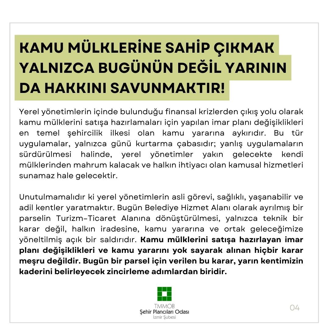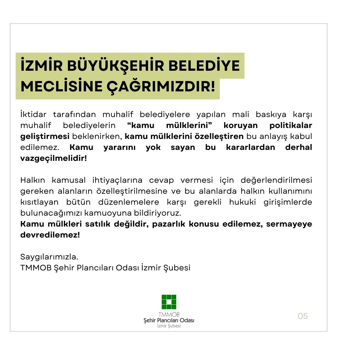 Şehir Plancıları Odası İzmir Şubesi olarak 8 Ağustos 2025 tarihinde yaptığımız basın açıklamasında yerel yönetimlerin "kamu mülklerini" koruyan politikalar geliştirmesini ve kamusal alanlara ilişkin düzenlemelerini tekrardan gözden geçirmesi uyarısında bulunmuştuk.