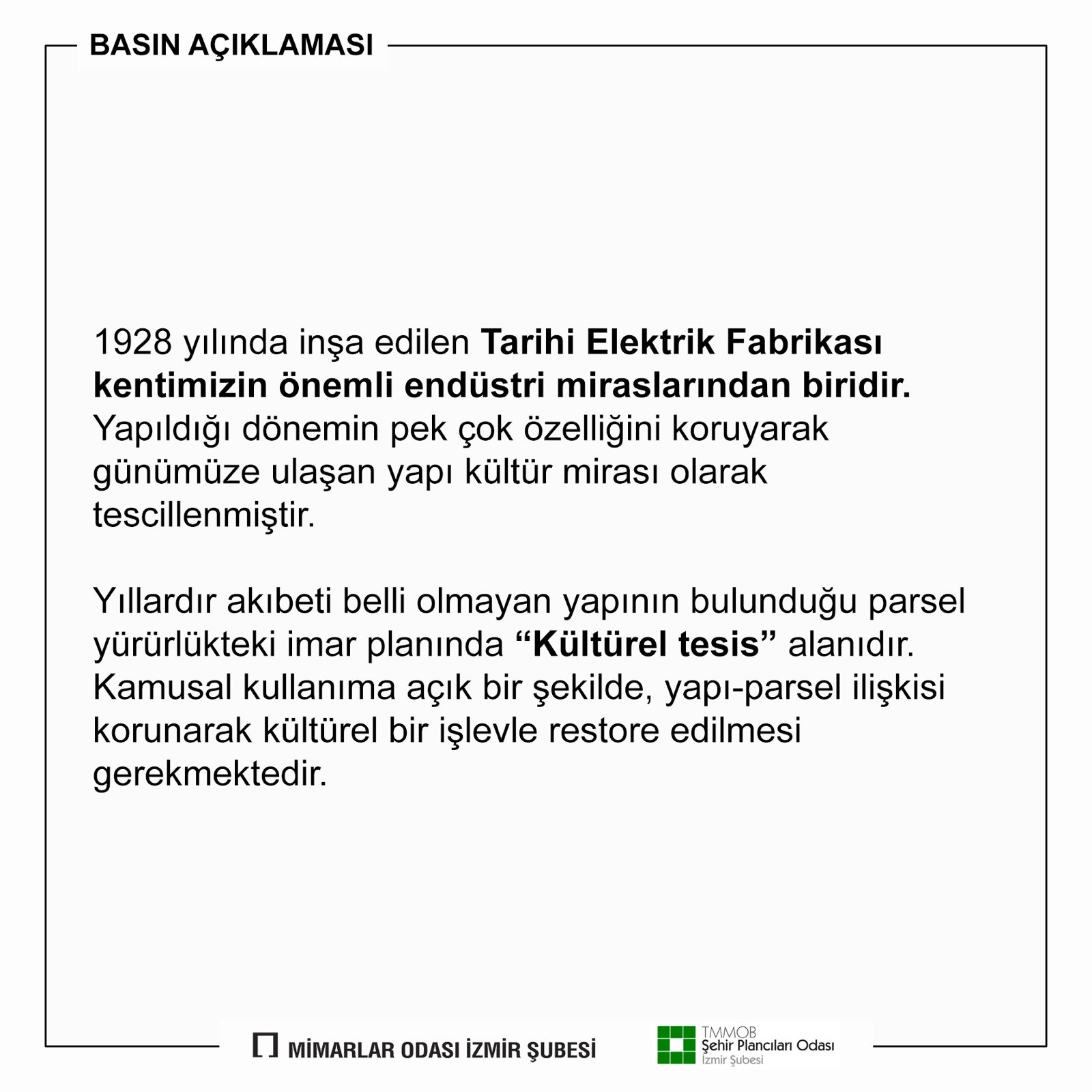 TARİHİ ELEKTRİK FABRİKASI KAMUNUNDUR! Mülk sahibi tüm İzmir halkıdır. Yıllar içinde yıpranma süreci hızlanarak devam eden yapının modern yöntemlerle restore edilerek KAMUSAL kullanımda kente kazandırılması için ilgili kurumlar gerekeni yapmalıdır.