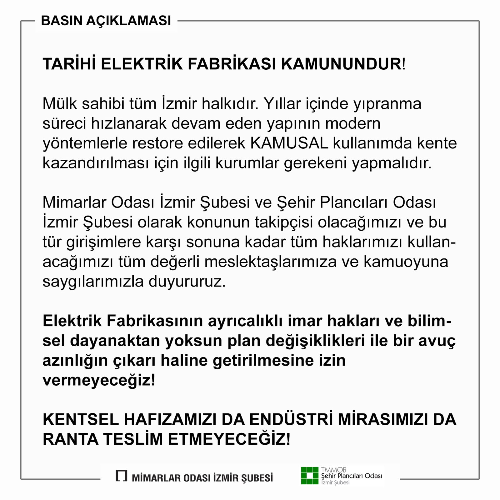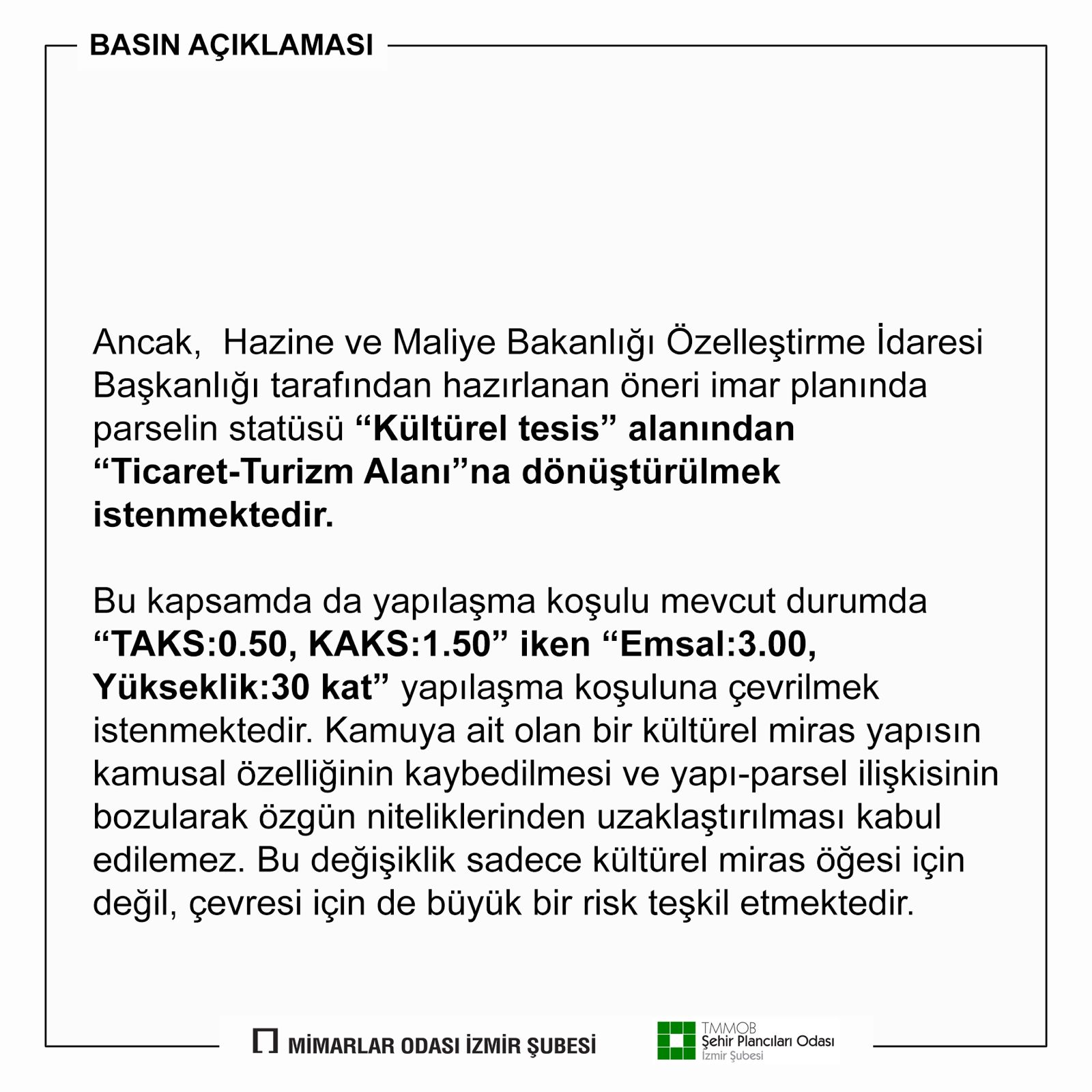 Şehir Plancıları Odası İzmir Şubesi ve Mimarlar Odası İzmir Şubesi olarak konunun takipçisi olacağımızı ve bu tür girişimlere karşı sonuna kadar tüm haklarımızı kullanacağımızı tüm değerli meslektaşlarımıza ve kamuoyuna saygılarımızla duyururuz.