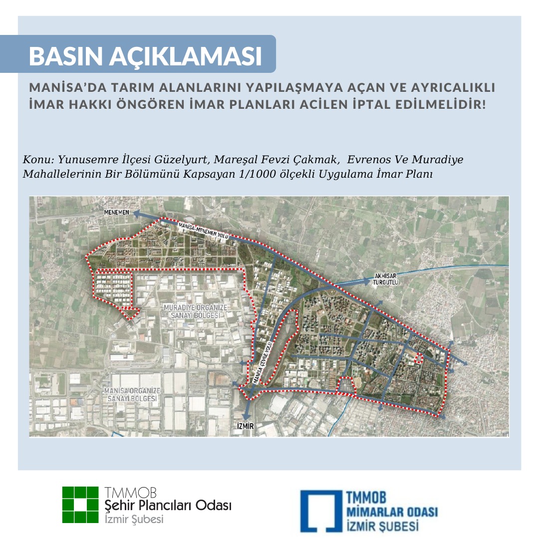 Basın açıklamamıza konu Yunusemre ilçesi sınırlarında 3 farklı bölgeyi kapsayacak şekilde onaylanan 1/1000 ölçekli Uygulama İmar Planları ağırlıklı olarak bilirkişi raporunda bahsi geçen tarım alanlarına isabet etmekte olup meslek odalarının yaşanan hukuksuzluk karşısında sessiz kalması mümkün değildir.