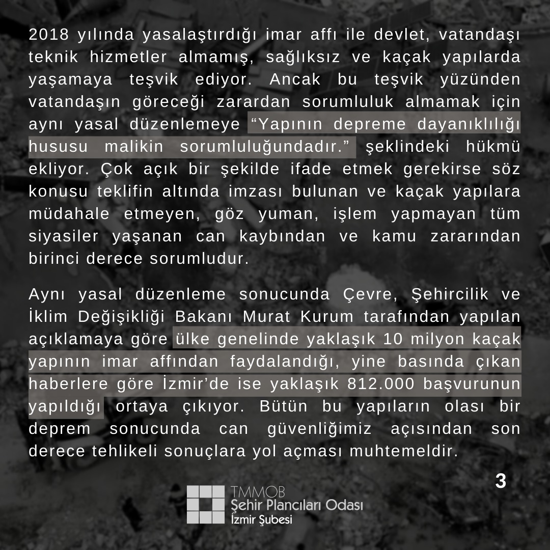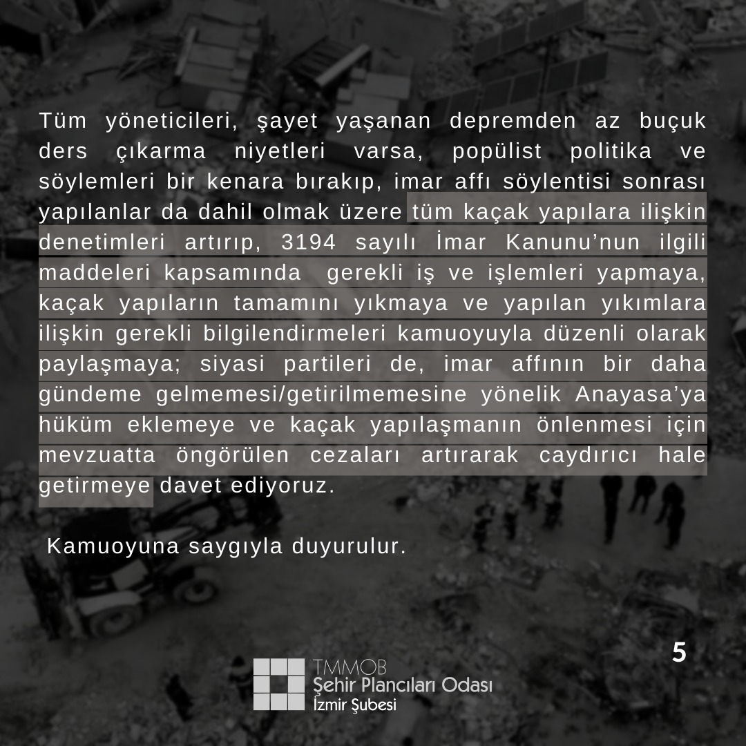 Tüm yöneticileri, şayet yaşanan depremden az buçuk ders çıkarma niyetleri varsa, popülist politika ve söylemleri bir kenara bırakıp, imar affı söylentisi sonrası yapılanlar da dahil olmak üzere tüm kaçak yapılara ilişkin denetimleri artırıp, 3194 sayılı İmar Kanunu`nun ilgili maddeleri kapsamında  gerekli iş ve işlemleri yapmaya, kaçak yapıların tamamını yıkmaya ve yapılan yıkımlara ilişkin gerekli bilgilendirmeleri kamuoyuyla düzenli olarak paylaşmaya; siyasi partileri de, imar affının bir daha gündeme gelmemesi/getirilmemesine yönelik Anayasa`ya hüküm eklemeye ve kaçak yapılaşmanın önlenmesi için mevzuatta öngörülen cezaları artırarak caydırıcı hale getirmeye davet ediyoruz.