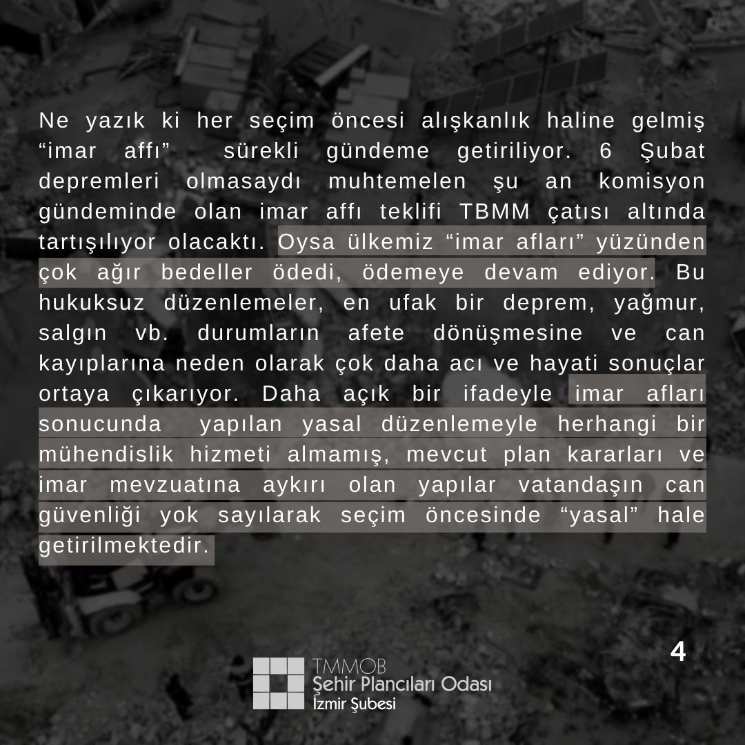 Ne yazık ki her seçim öncesi alışkanlık haline gelmiş "imar affı"  sürekli gündeme getiriliyor. 6 Şubat depremleri olmasaydı muhtemelen şu an komisyon gündeminde olan imar affı teklifi TBMM çatısı altında tartışılıyor olacaktı. Oysa ülkemiz "imar afları" yüzünden çok ağır bedeller ödedi, ödemeye devam ediyor. Bu hukuksuz düzenlemeler, en ufak bir deprem, yağmur, salgın vb. durumların afete dönüşmesine ve can kayıplarına neden olarak çok daha acı ve hayati sonuçlar ortaya çıkarıyor. Daha açık bir ifadeyle imar afları sonucunda  yapılan yasal düzenlemeyle herhangi bir mühendislik hizmeti almamış, mevcut plan kararları ve imar mevzuatına aykırı olan yapılar vatandaşın can güvenliği yok sayılarak seçim öncesinde "yasal" hale getirilmektedir.