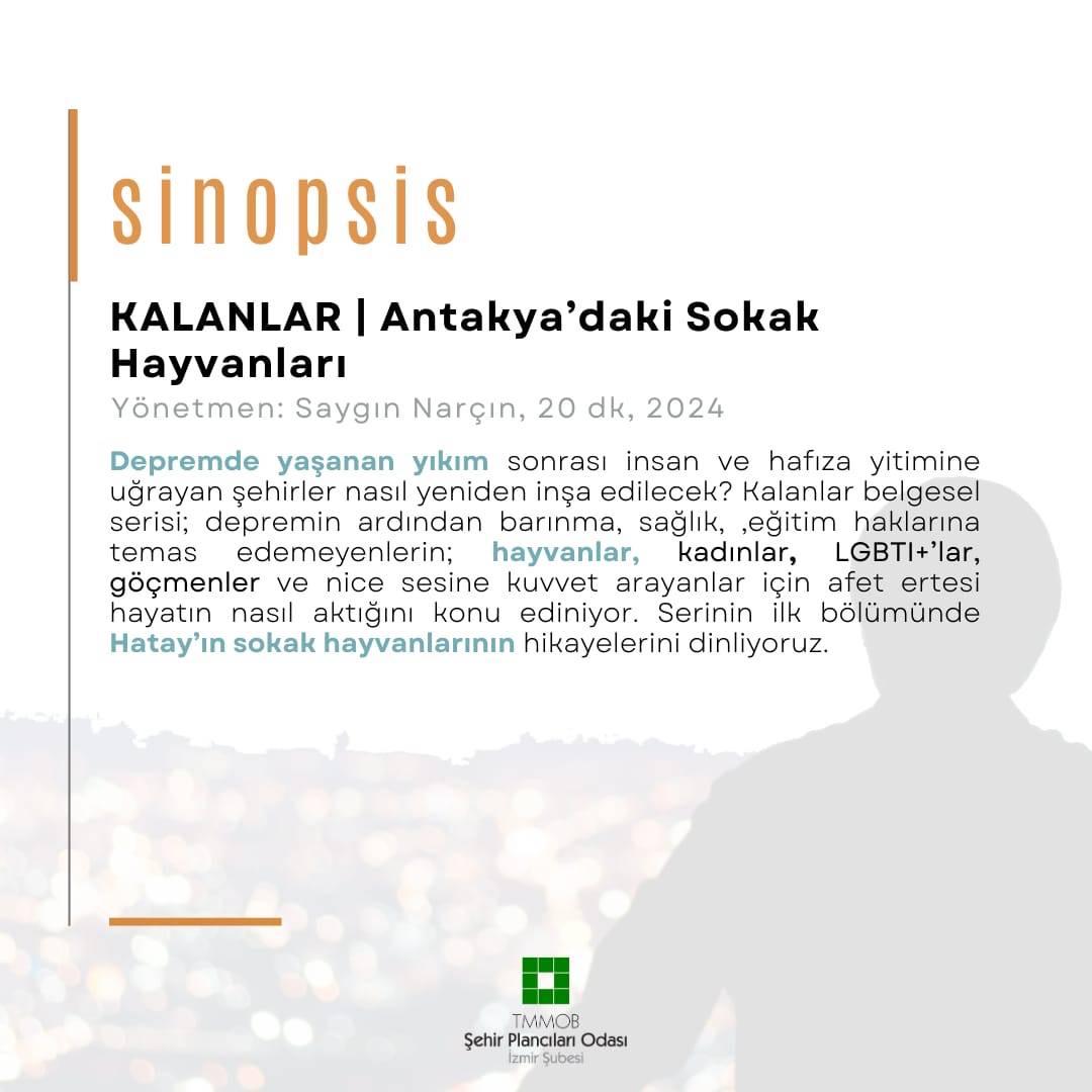 Filmin Konusu: Depremde yaşanan yıkım sonrası insan ve hafıza yitimine uğrayan şehirler nasıl yeniden inşa edilecek? Kalanlar belgesel serisi; depremin ardından barınma, sağlık, ,eğitim haklarına temas edemeyenlerin; hayvanlar, kadınlar, LGBTI+`lar, göçmenler ve nice sesine kuvvet arayanlar için afet ertesi hayatın nasıl aktığını konu ediniyor. Serinin ilk bölümünde Hatay`ın sokak hayvanlarının hikayelerini dinliyoruz.